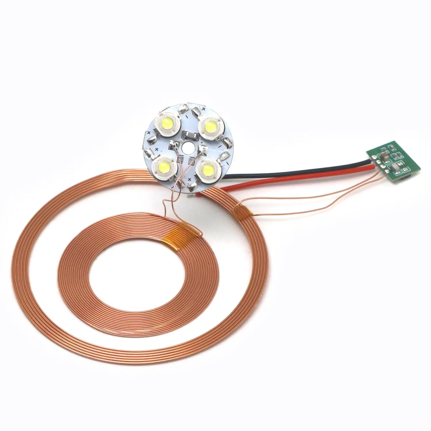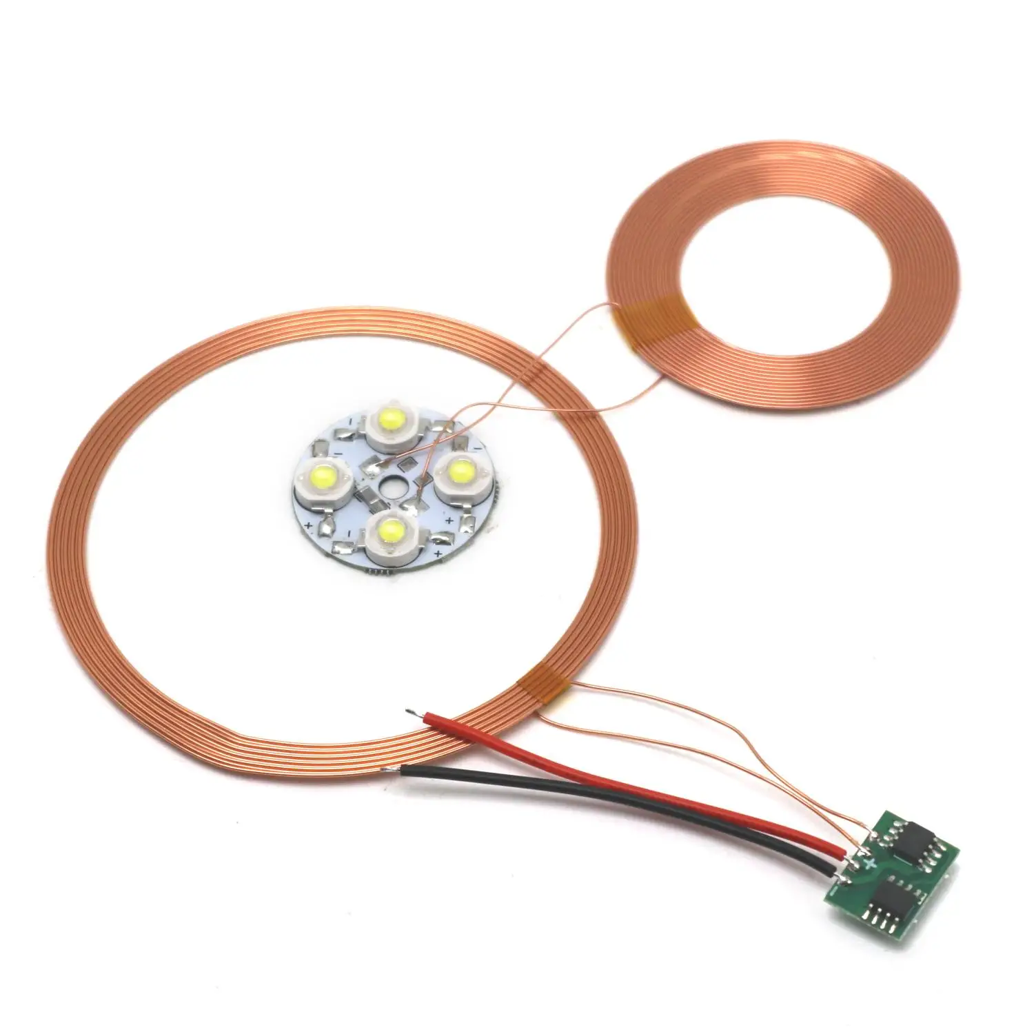 - The receiver coil measures 51mm outer diameter, 30mm inner diameter, with a 0.6mm thickness, capable of directly powering four 1W high-power LEDs for bright, consistent illumination.