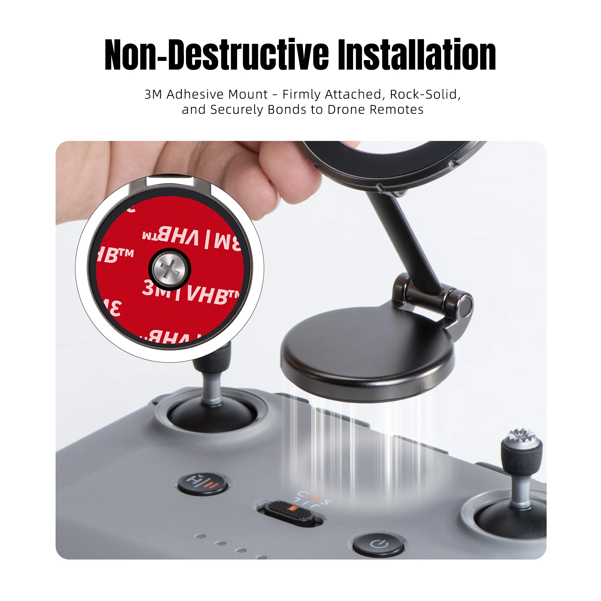 Experience seamless control with this black magnetic mount, designed specifically for DJI remote controllers including N1, N2, N3, Mini 3 Pro, Mini 3, Mini 2, Mavic 3 series, Air 2S, Air 3, Mini 4 Pro, Neo, Flip, Mini 4 Pro, Air 3S, Mini 5 Pro, and Neo 2. Its minimalist design combines elegance and practicality, offering a slim, foldable arm that easily adjusts for optimal positioning. The magnetic circular ring securely attaches to your smartphone, providing stability even during active shoots. The flat, beveled base ensures stability when placed on surfaces, allowing you to focus on capturing stunning visuals without worry. Crafted without harmful chemicals and built with high-quality materials, this mount perfectly balances style with functionality, making your drone flying and shooting experience more comfortable, reliable, and efficient.