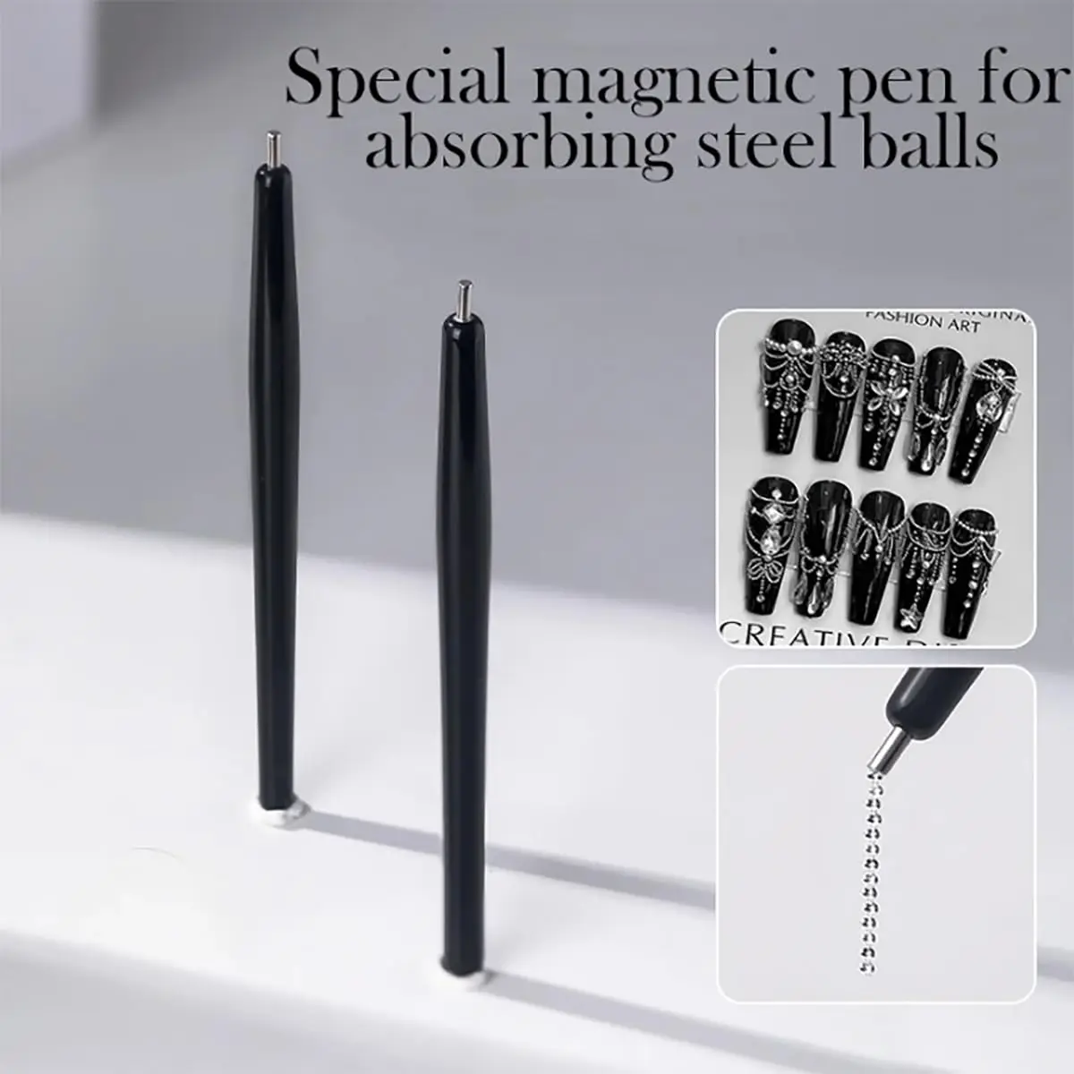 Imagine effortlessly creating stunning nail designs with this sleek magnetic nail art pen. Its smooth black plastic body provides a modern, minimalist aesthetic while ensuring comfortable handling. The tiny metallic steel ball tip is designed for magnetic attraction, allowing you to easily place steel beads and small metallic embellishments onto nails. Perfect for both professional salons and home use, this tool enhances your manicure craftsmanship. Its simple yet sophisticated design makes it easy to manipulate delicate details, bringing your nail art ideas to life with precision and style. Whether you prefer intricate patterns or simple accents, this pen delivers reliable performance every time, helping you achieve salon-quality results. Enjoy creating personalized designs that truly stand out.