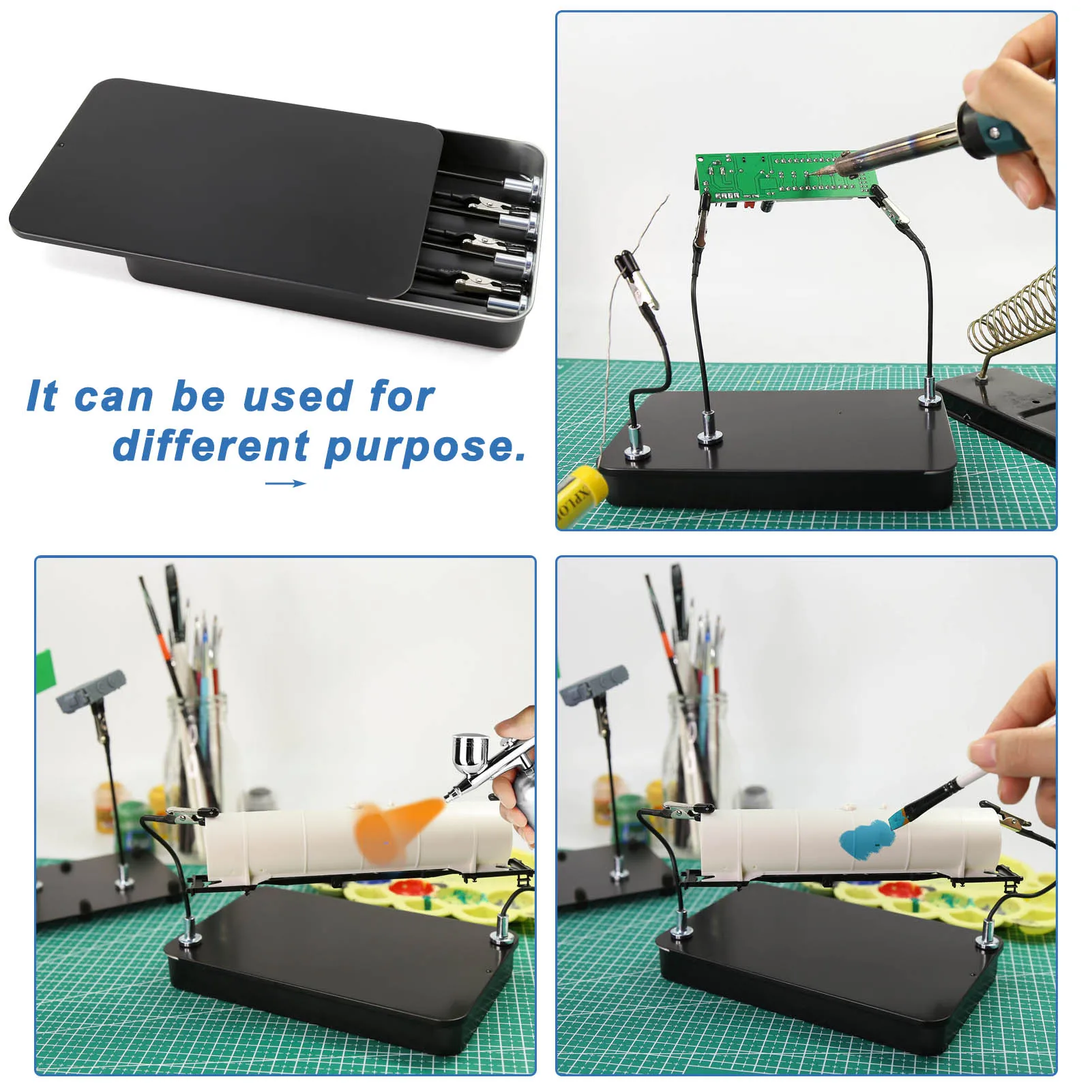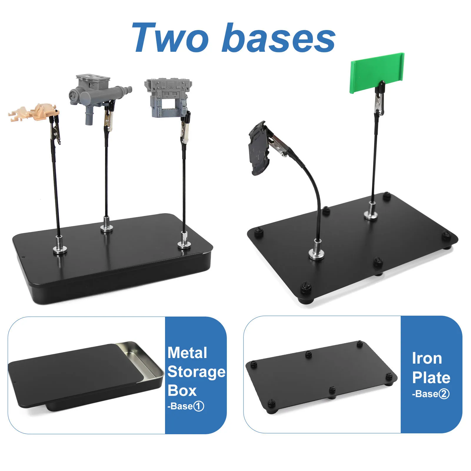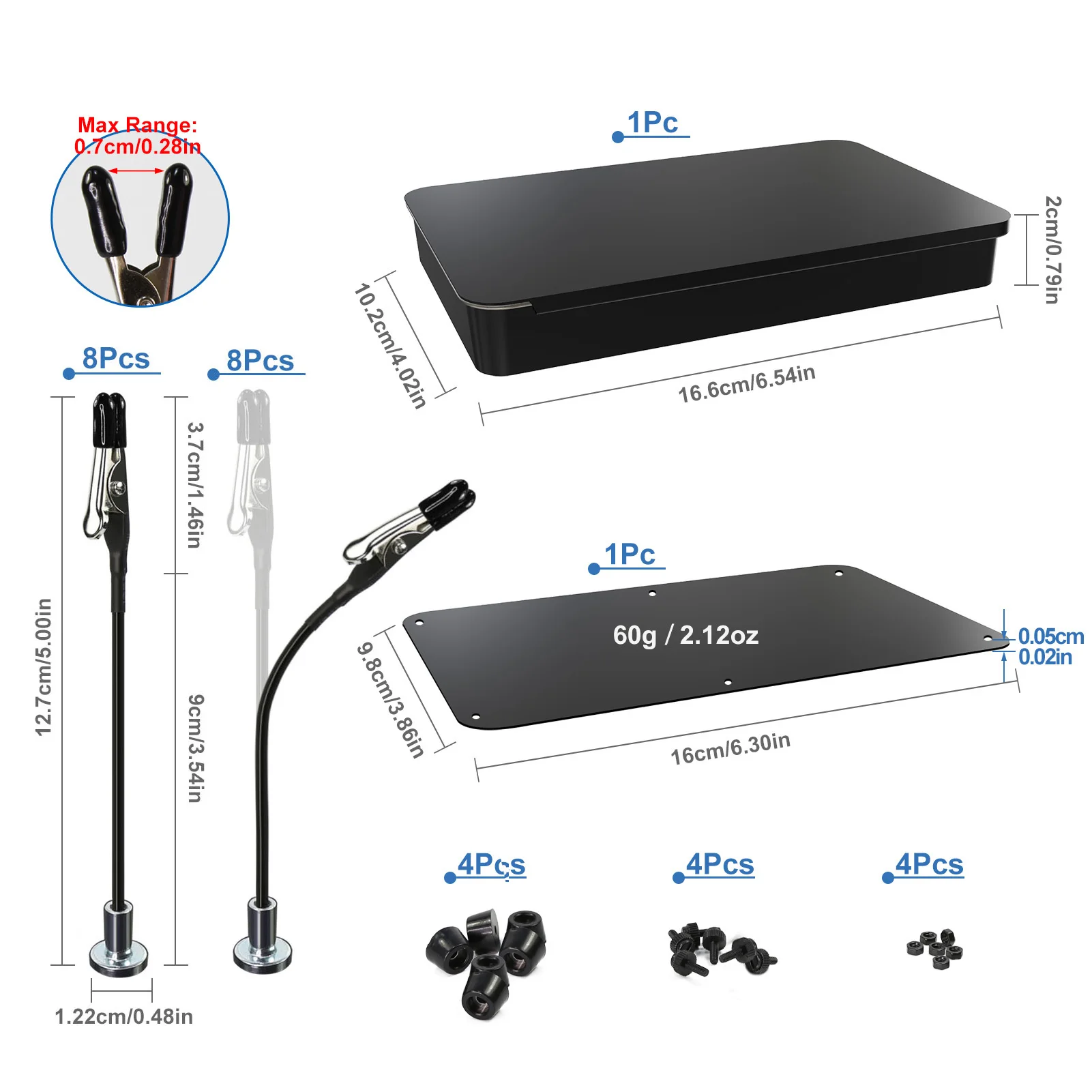 Enhance your model crafting with this premium set of 8 straight and 8 bendable magnetic painting clips, crafted from high-quality, rust-resistant metal. Each clip features a durable rubber cover to prevent damage and hold heavy or delicate parts securely. Supported by a strong magnet base, the clips provide stable placement on metal surfaces, while the sleek metal storage box doubles as a stand and organizer. Included extras, such as an iron plate and screws, expand your painting platform options. Designed for adult hobbyists, this durable, versatile tool set ensures precise, stable model assembly and painting with an elegant, industrial aesthetic.