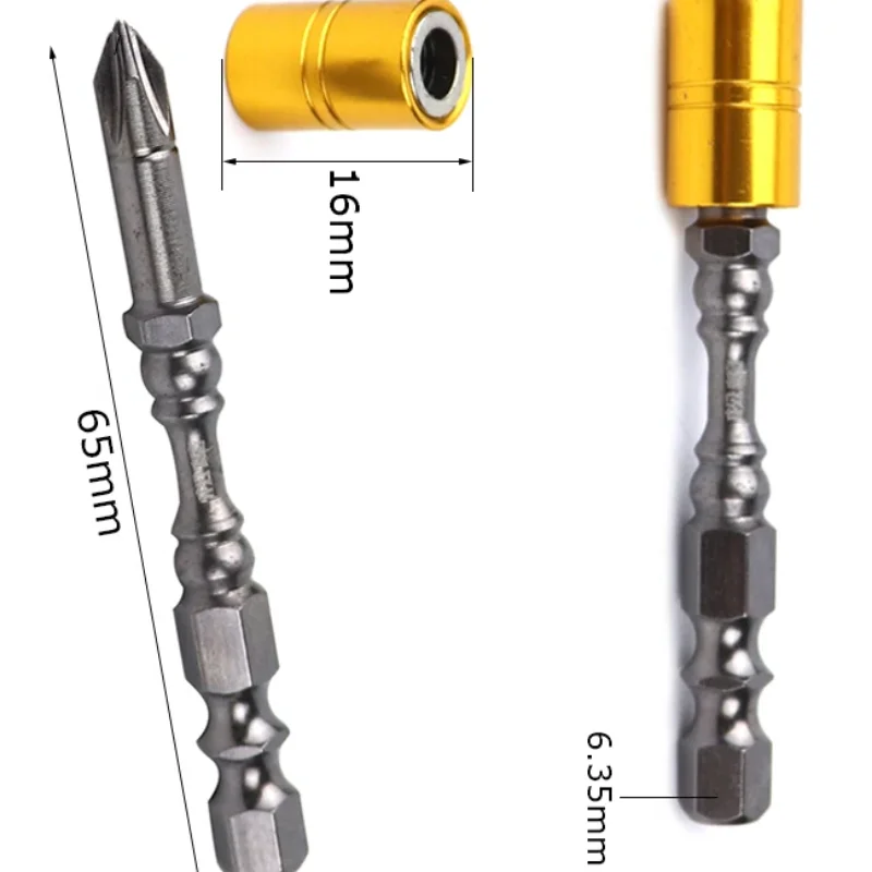 Enhance your toolkit with this 5-piece set of Phillips screwdriver bits crafted from durable alloy steel, each 65mm long. Featuring a 1/4” (6.35mm) screw head size, these bits are optimized for electronic devices and drywall screws. Designed with strong magnetic properties, they securely hold screws for efficient, precise work. The bits showcase a sleek metallic silver finish with interchangeable, bright gold-colored handle sections for quick identification and added visual appeal. Their robust construction and organized design make these bits ideal for professional and DIY enthusiasts working on electronics, drywall, or other precision projects, ensuring reliability and ease of use in every application.