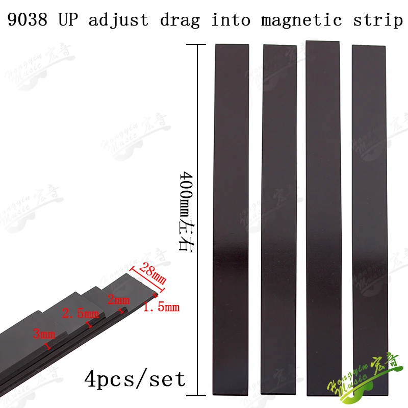 - Set of four magnetic strips with sizes 1.5mm, 2mm, 2.5mm, and 3mm for versatile piano tuning needs. Designed for accurate vertical adjustment in upright pianos.