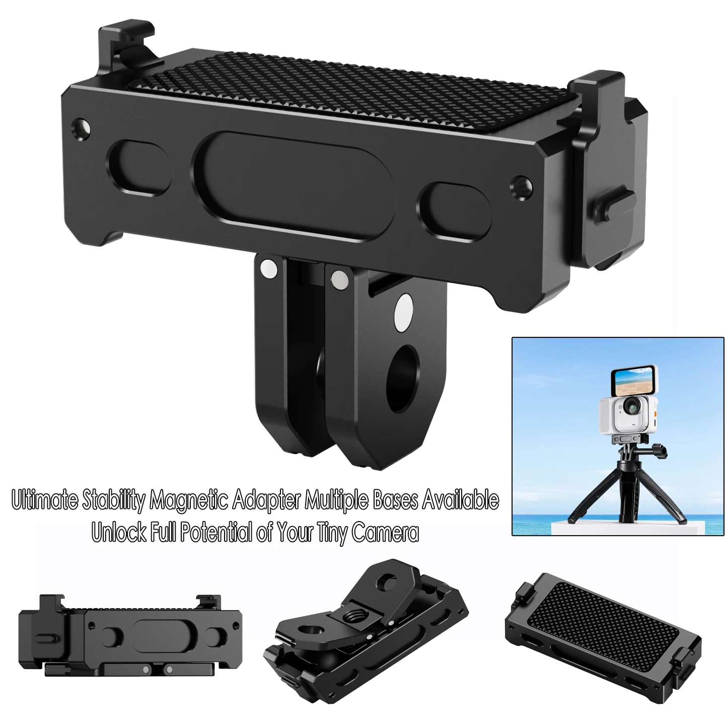 Enhance your Insta360 GO Ultra experience with this CNC-machined 6061-T6 aluminum magnetic quick-release base featuring a sleek black anodized finish. Equipped with four N52 neodymium magnets rated for a 5 kg pull force, it offers secure attachment and effortless detachment. Compatible with 1/4″-20 threaded accessories, it supports 45° tilt, 360° damping, and ball-head configurations with diameters of 17 mm or 25.4 mm. The base features anti-slip silicone pads, precise manufacturing tolerances of ±0.05 mm, and a maximum payload capacity of 200 g, making it ideal for active filming scenarios requiring quick, reliable mounting and versatile angles without tools.