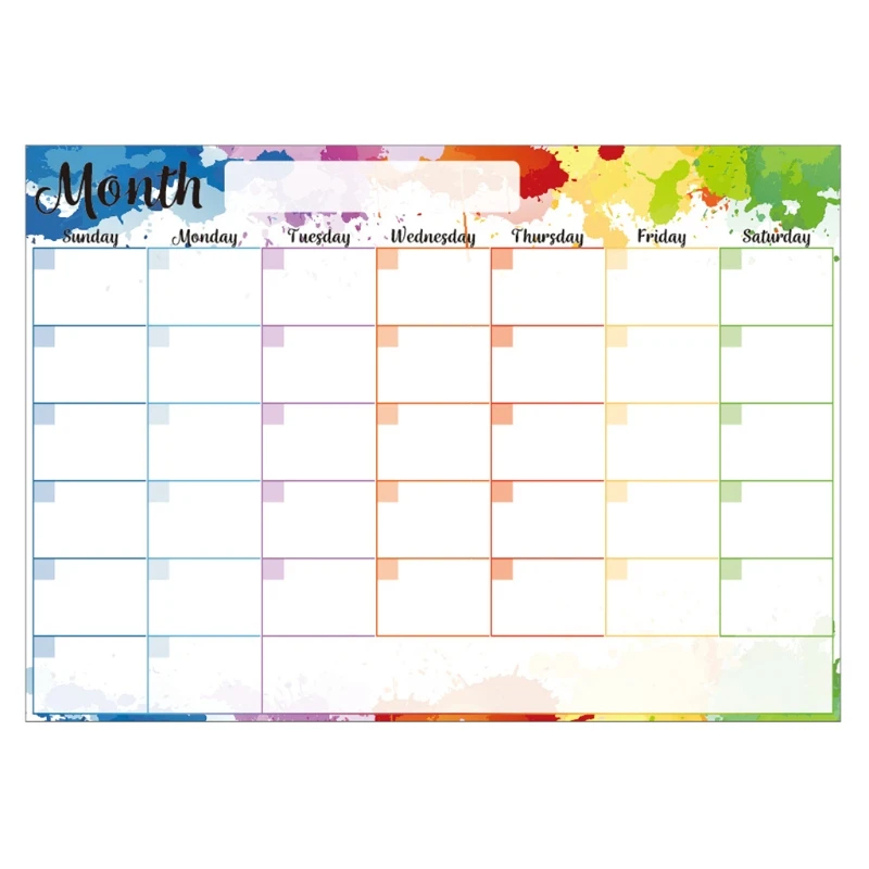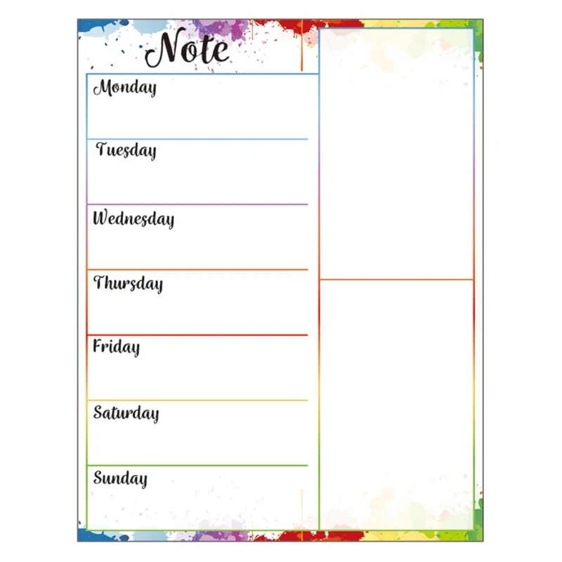 The Soft Whiteboard Sheet is your essential tool for efficient monthly and weekly scheduling. Measuring approximately 42×29.7 cm (16.53×11.69″) for the monthly plan and 17.8×23 cm (7.00×9.05″) for the weekly plan, this innovative board features a vibrant splash design that adds energy to your planning routine. Made from durable PET film and backed with a strong rubber magnet, it easily adheres to metal surfaces such as fridge doors or file cabinets. The dry erase surface allows for seamless writing and wiping, ensuring your plans stay fresh and clear. With its lively aesthetics, this whiteboard not only guides your scheduling but also enhances your space.