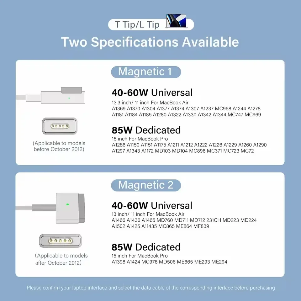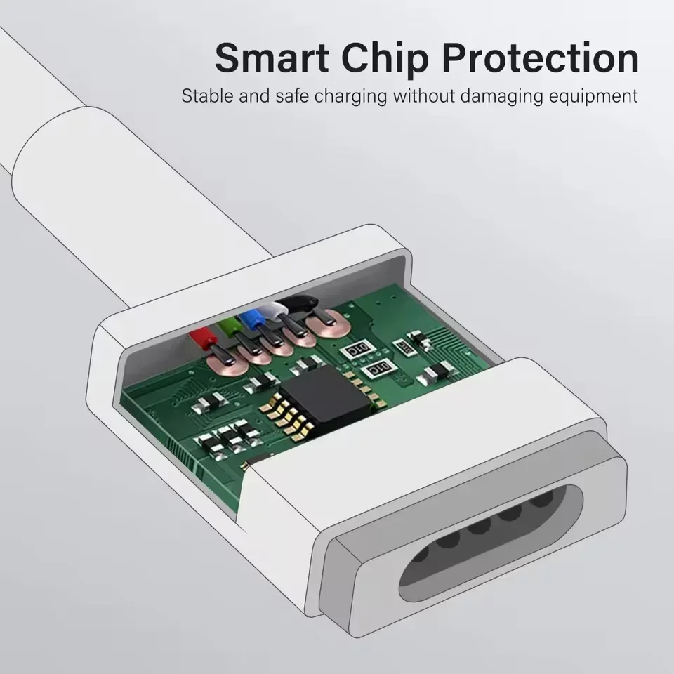 Elevate your MacBook charging experience with this durable, flexible 1.8-meter MagSafe 1/2 replacement cable, designed for MacBook Air and Pro models (13, 15, and 17″). Crafted from high-quality TPE material for resilience and tangle resistance, it supports 45W, 60W, and 85W power adapters. The cable features a sleek, minimalist white connector with a secure magnetic snap for effortless, safe attachment and detachment, complemented by a subtle green LED indicator for power status. Built-in protection against overheating and short circuits ensures reliable performance. Available in two variants, Mag1-L and Mag2-T, this safety-certified cable offers an affordable, dependable upgrade or replacement for your Apple device.