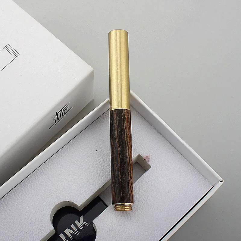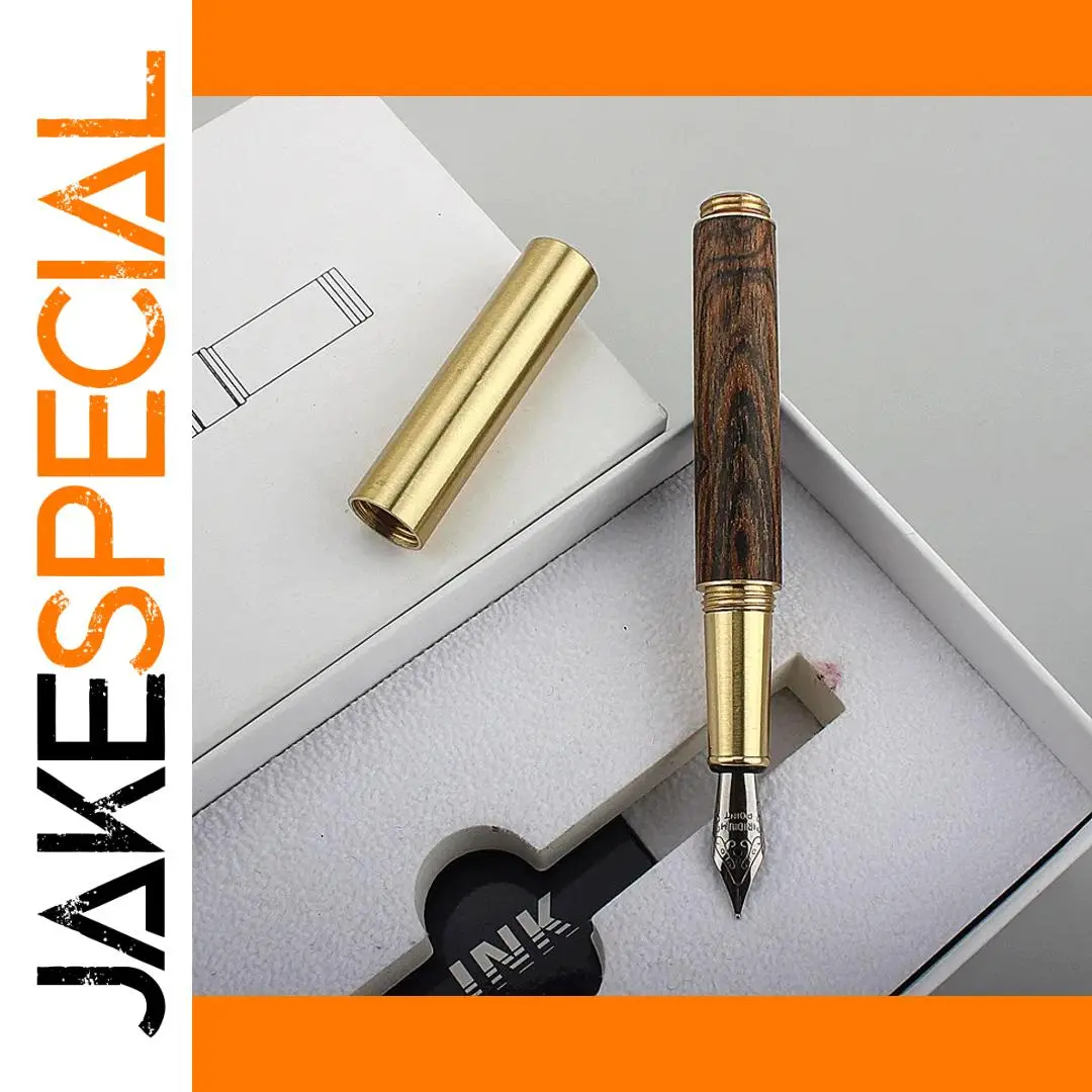 Imagine elevating your writing experience with this handcrafted wooden fountain pen, crafted from rich, natural mahogany. Its deep, dark streaks and polished finish showcase exquisite wood grain patterns, giving each piece a unique, timeless appeal. The elegant cylindrical design is enhanced by gold-colored metallic fittings, including a tapered grip and decorative bands that lend an air of luxury. The silver-toned stainless steel nib features intricate engravings, reflecting excellent craftsmanship, and offers smooth ink flow for fine writing. This pen is perfect for those who appreciate craftsmanship and style, making it an ideal gift or personal treasure. Visualize yourself confidently writing with this stunning, sophisticated tool that combines natural beauty and high-quality engineering.