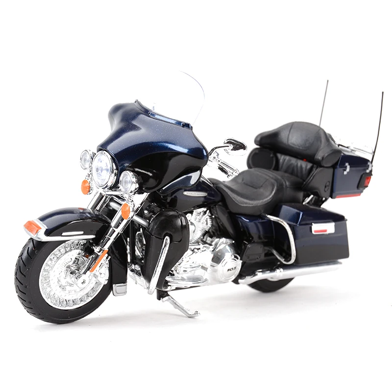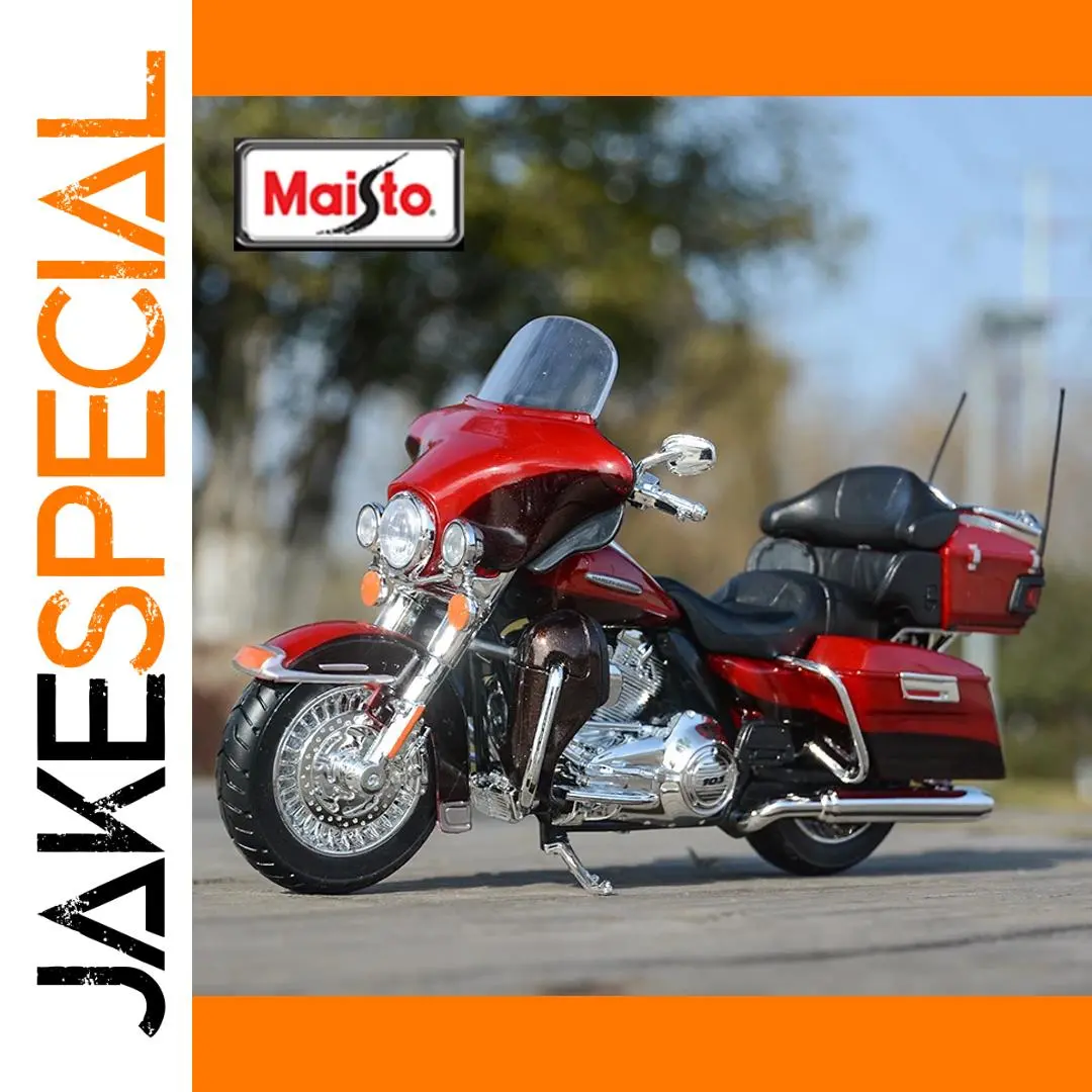 This stunning 1:12 scale model of the 2013 Electra Glide Ultra Limited by Maisto captures the essence of a classic touring bike. Its striking glossy red finish combined with chrome accents creates an eye-catching aesthetic that any motorcycle enthusiast would love to display. The intricate details, from the large front fairing and clear windshield to the comfortably padded seat and saddlebags, evoke the thrill of long-distance rides. With the added touch of realistic moving parts, including a swinging front wheel and a movable kickstand, this model brings the adventure of the open road right to your home.