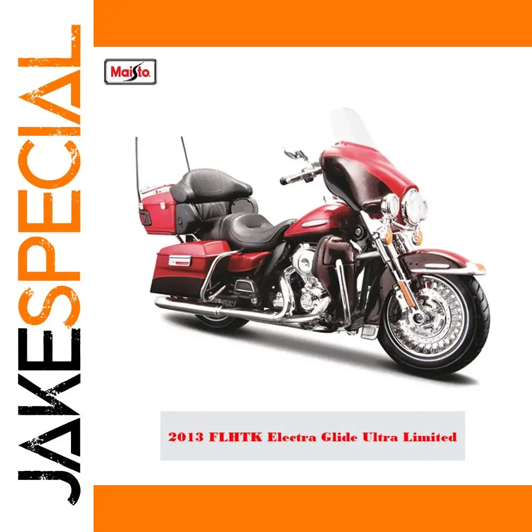 This stunning die-cast model of the 2013 FLHTK Electra Glide Ultra Limited motorcycle by Maisto captivates collectors with its rich, deep red body and glossy finish. Perfectly scaled at 1:12, the model showcases intricate chrome accents and realistic features, including round chrome headlights and a tinted windshield. The comfortable black leather-like seat, coupled with a functional rear compartment, adds practicality to its aesthetic appeal. Admire the detailed tread patterns on the robust tires, emphasizing the authenticity of this magnificent piece, designed for passionate motorcycle enthusiasts seeking high-quality craftsmanship to complete their collection.