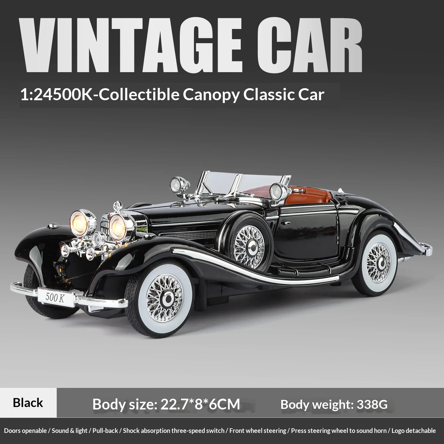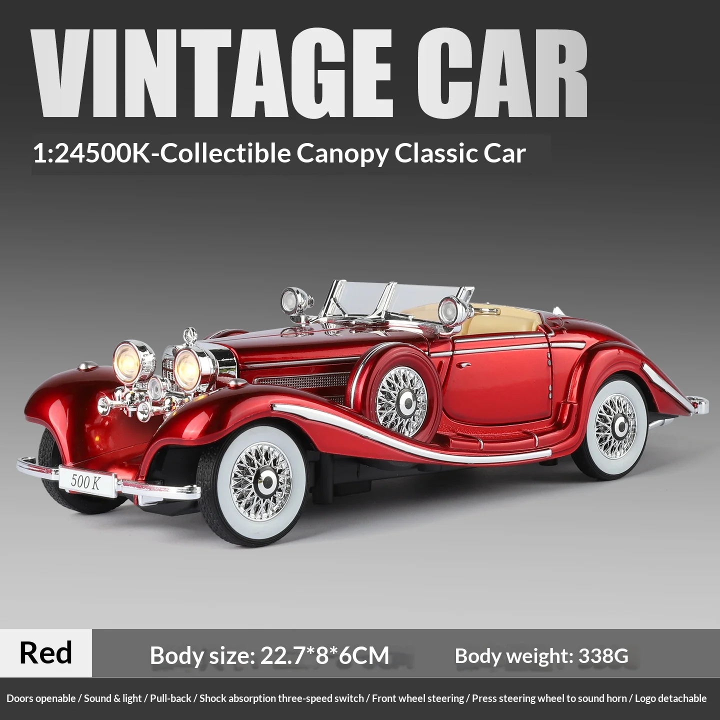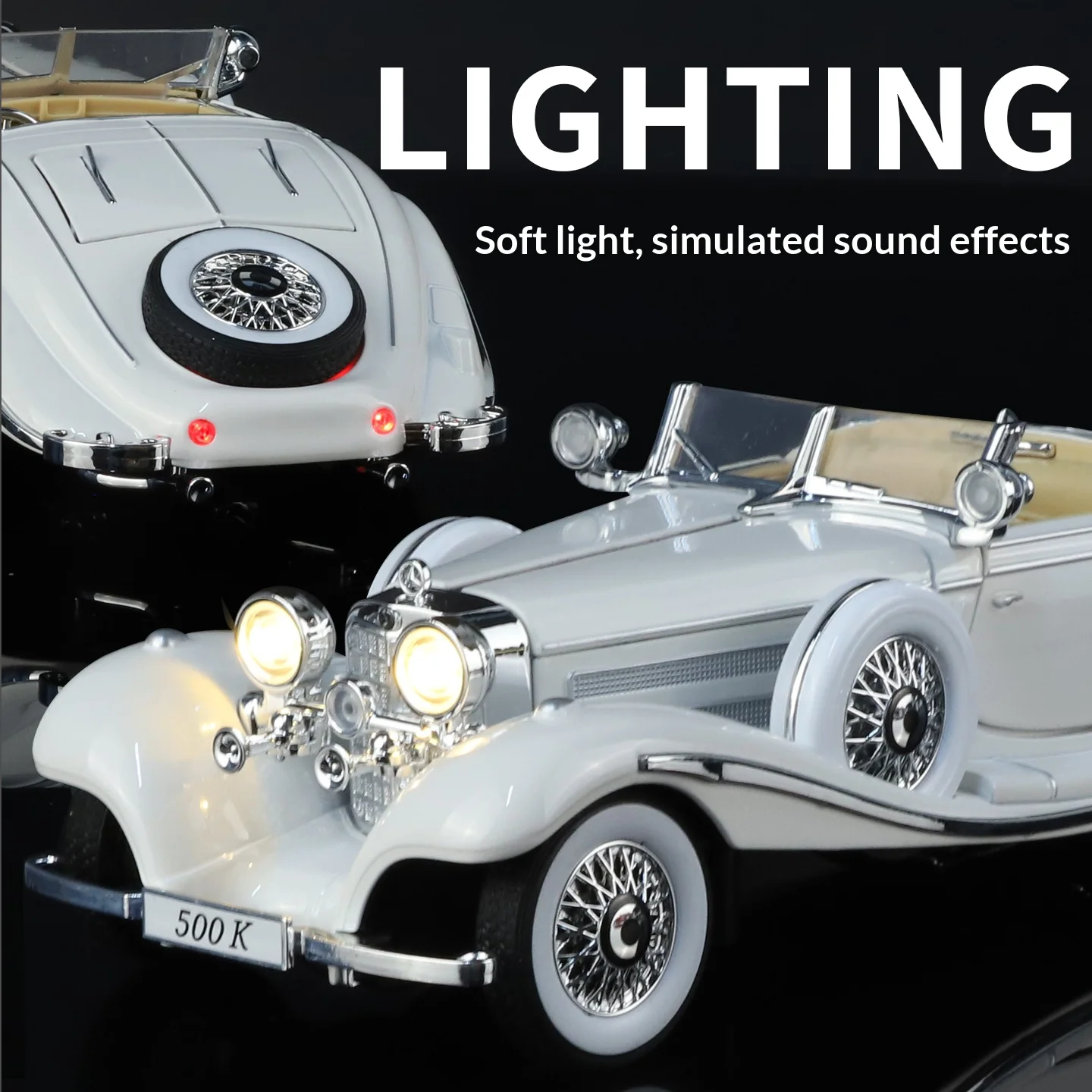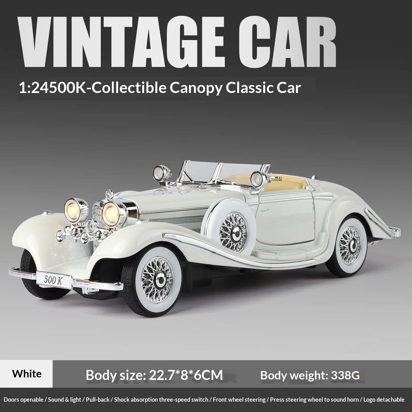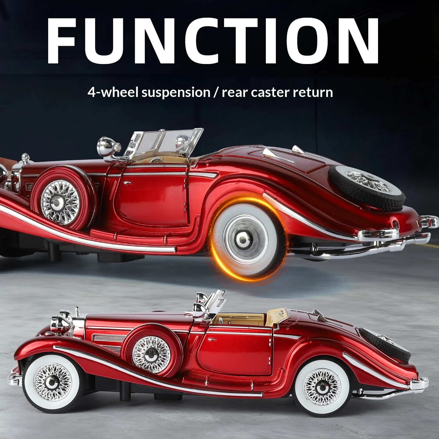 Immerse yourself in the timeless charm of this detailed 1:24 scale diecast model car, expertly crafted to resemble a vintage luxury automobile. Available in elegant black, striking red, or pristine white, this model features a shiny alloy exterior that echoes the sophistication of classic cars. Its meticulously designed curves, chrome accents along the sides and wheel arches, and vintage-style wire-spoke rims make it a perfect decorative piece or collector’s item. The front showcases dual round headlights with warm yellow tint, supported by chrome supports, and complemented by tiny auxiliary lights. From the gracefully sweeping rear to the realistic fine details, this model embodies nostalgia and luxury, allowing you to bring a piece of automotive history into your space.