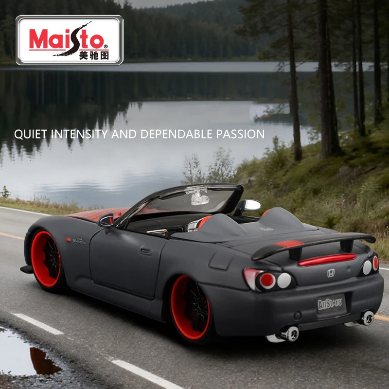 This 1:24 scale diecast miniature model of a Honda S2000 features a sleek aerodynamic design with a matte gray finish, alloy and plastic construction, and intricate detailing including sharp headlights, subtle door handles, and a vibrant red and black decal on the hood. The black multi-spoke rims with red accents, black rounded side mirrors, transparent windshield and windows revealing a red interior, and a small rear spoiler contribute to its sporty aesthetic. Perfect for display or collection, this high-quality replica is designed for enthusiasts aged 14 and up, offering a realistic and stylish representation of the iconic sports car.