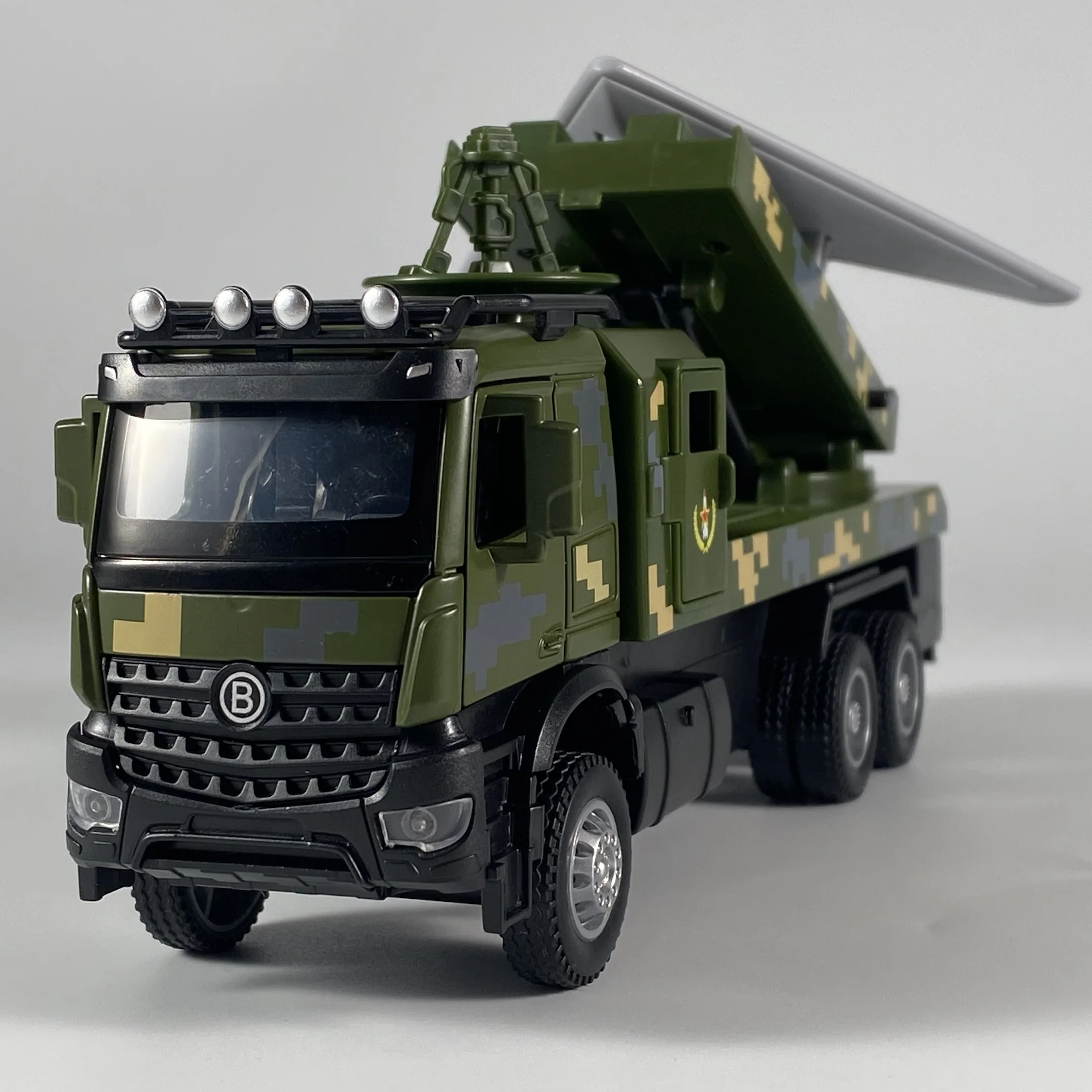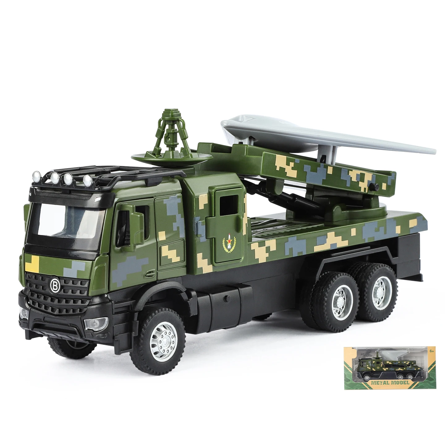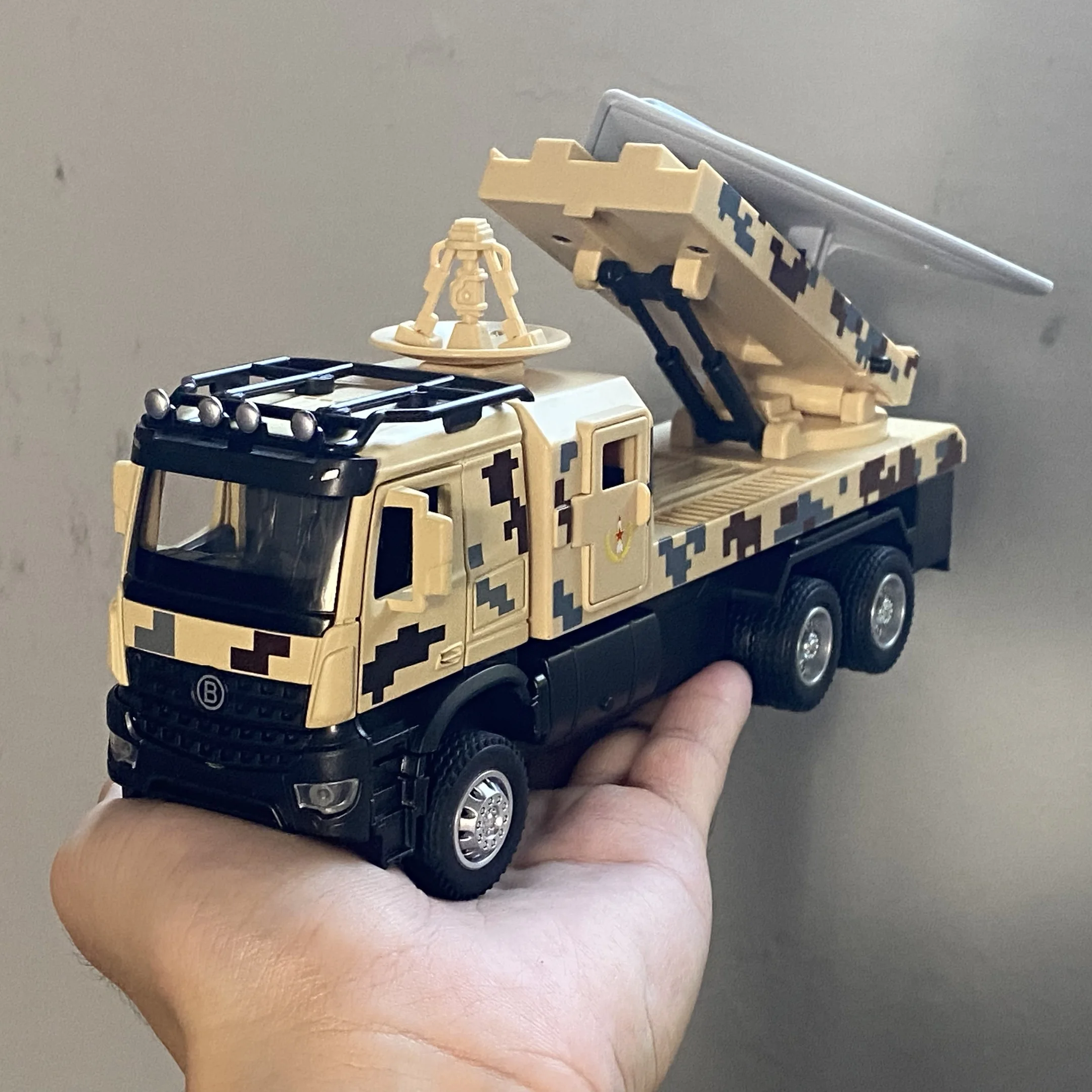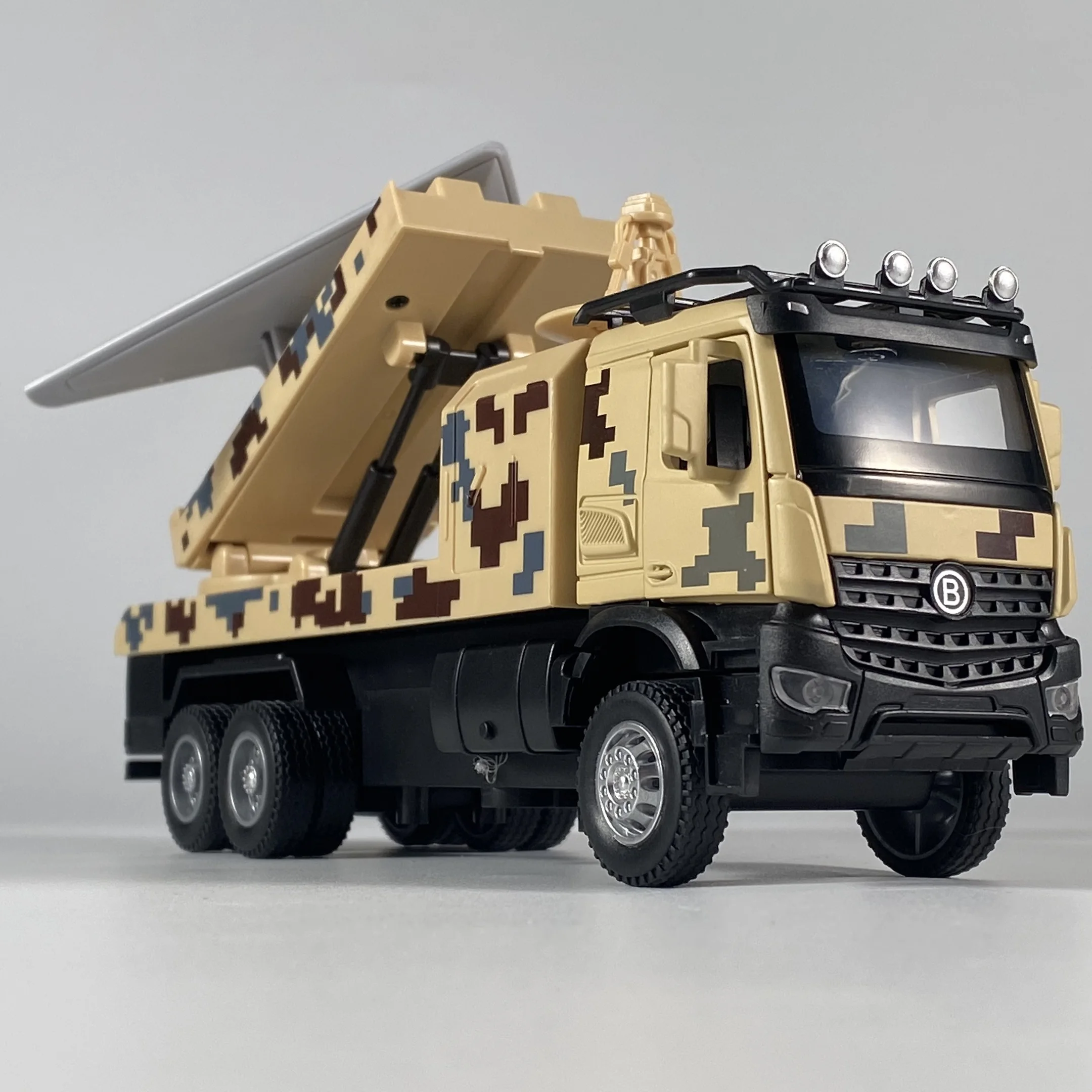 Experience the thrill of military strategy with this highly detailed diecast model of a UAV attack launch vehicle. Crafted with a bevy of realistic features, this model showcases a sleek, metallic beige finish accented by a digital camouflage pattern in dark brown or black, embodying a tactical, military aesthetic. Its compact 1:35 scale lends a highly realistic look, perfect for display or collection. The model includes functional sound and light features, hidden discreetly within the design, enhancing play and display value. The cab features clear plastic windows revealing intricate interior details, and the textured, grid-patterned flatbed adds a realistic touch. Its overall design exudes precision and military grit, making it an exceptional addition to any collection of tactical models or military memorabilia.
