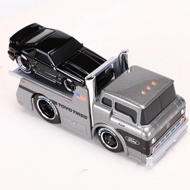 - 1:64 scale diecast model with authentic vintage truck and sports car representation.