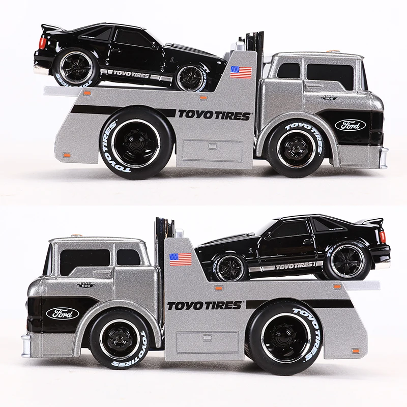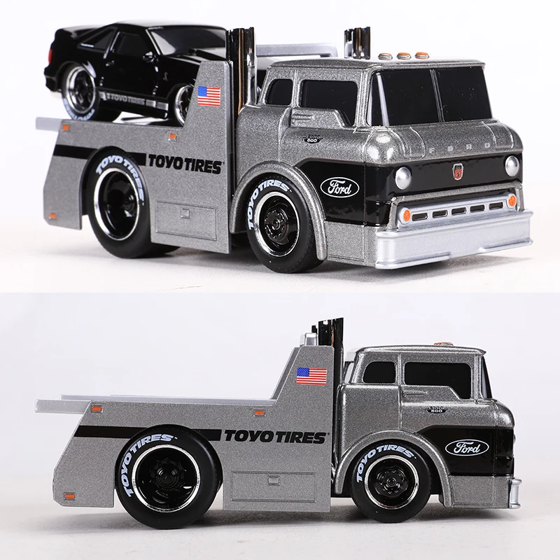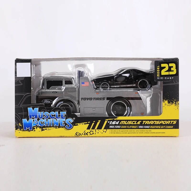 Experience the timeless appeal of vintage and modern with this meticulously crafted diecast model set. The flatbed truck, inspired by the classic 1966 Ford C600, stands out in a matte gray finish, capturing its robust and angular design with realistic details like black accents, tinted windows, and subtle roof lights. The textured flatbed platform adds to its authenticity, perfectly accommodating the sleek black 1993 Ford Mustang SVT Cobra. Both vehicles showcase precise proportions, detailed rims, and authentic styling cues that evoke the charm of past eras while offering modern craftsmanship. This set invites car enthusiasts and collectors to visualize themselves owning a unique display that blends vintage ruggedness with sporty elegance. It’s truly a standout piece for any collection.