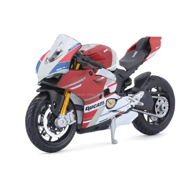 Experience the thrill of high-performance racing with this detailed 1:18 scale die-cast Ducati Panigale V4 S Corse motorcycle model by Maisto. Measuring approximately 12cm x 4.5cm x 6.5cm, it features a metallic alloy fuel tank with a glossy finish, complemented by intricately detailed plastic parts in vibrant red, accented with white, black, and subtle blue highlights. The model boasts realistic features such as a swinging front wheel and handlebar, movable kickstand, spring-loaded rear suspension, and free-rolling wheels, capturing the dynamic essence of the original bike. Crafted for adult collectors and enthusiasts, this premium miniature offers exceptional craftsmanship and authentic aesthetic details, making it a perfect display piece.
