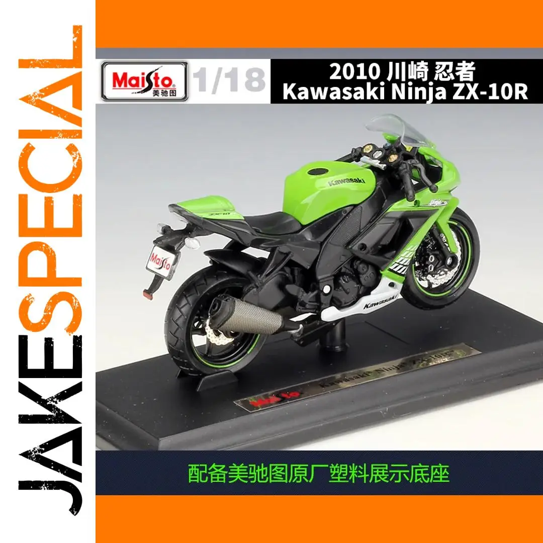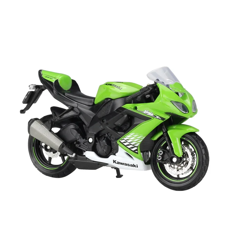 - This 1:18 scale diecast model features a vibrant neon green color with black accents for a striking, authentic look of the Kawasaki Ninja ZX-10R motorcycle. The aerodynamic fairings and detailed components add realism.