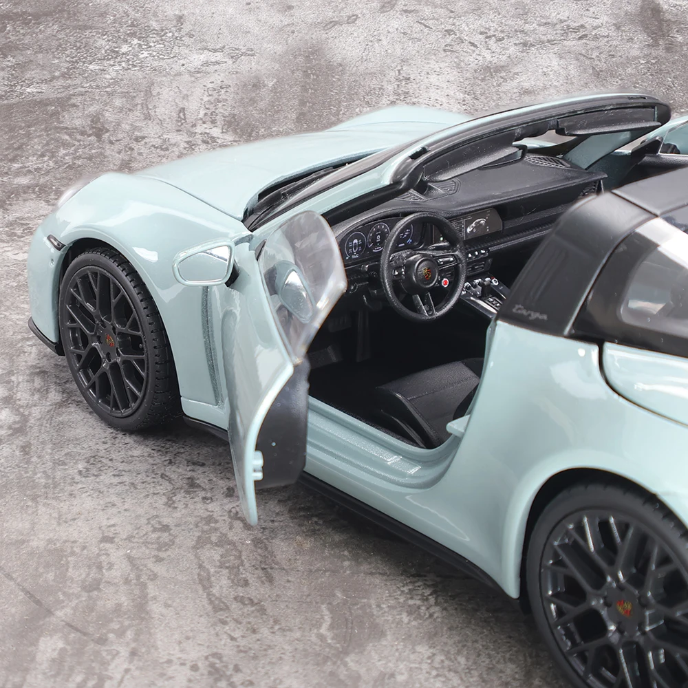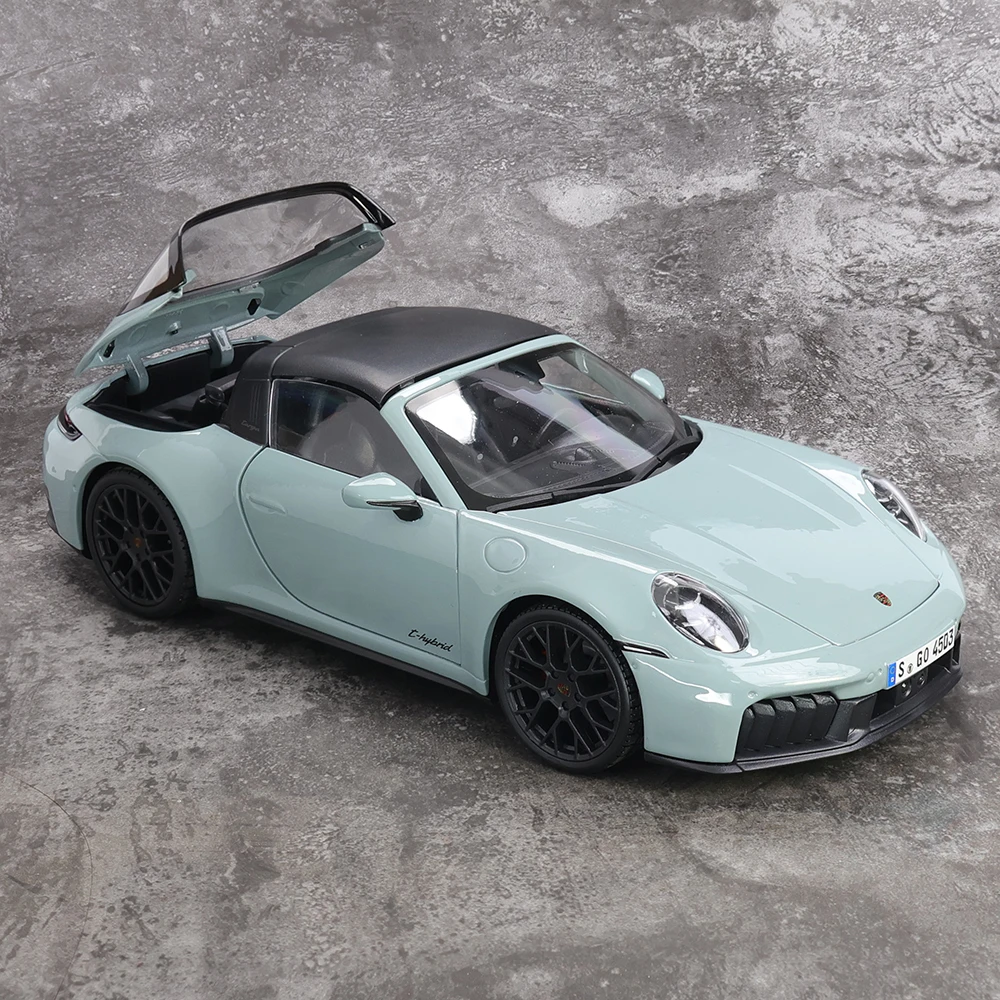 Imagine owning this stunning miniature replica of the Porsche 911 Tarqa 4 GTS (992.2), perfectly capturing its sleek, sporty essence. The model’s light pastel color, reminiscent of mint or icy blue, gives it a refined look that stands out on any collection display. Its smooth, aerodynamic contours and detailed front features—rounded headlights and a subtle grille—highlight Porsche’s signature design. The multi-spoke black rims and treaded tires add to its realistic appeal. With a carefully crafted open trunk, detailed interior, and engine bay, this model embodies both luxury and performance. Made from metal alloy, it offers exceptional durability and a premium feel, making it a prized collector's item or a thoughtful gift for enthusiasts. Envision this striking piece already part of your collection!