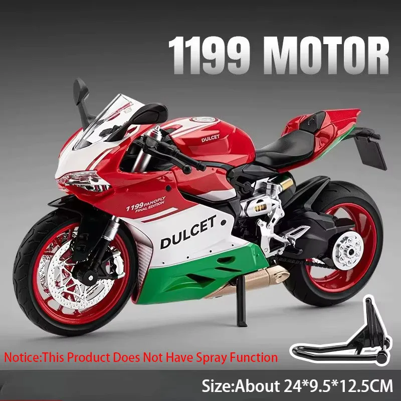 Experience the thrill of high-speed racing with this meticulously crafted MAKEDA 1/9 scale diecast motorcycle. Measuring approximately 23.5 x 5 x 13.5 cm for model 1299 or 24 x 9.5 x 12.5 cm for model 1199, it offers a perfect balance between display presence and intricate detail. The model boasts a durable alloy body finished with a glossy metallic paint in striking red, green, or white colors, inspired by high-performance racing aesthetics. Its aerodynamic design features a sharply contoured windshield, a marked fuel tank with white stripes, and detailed mechanical components like an intricate engine and disc brake rotors. With interactive features such as functional front wheel steering, shock absorption, and built-in sound and light effects powered by included batteries, it provides a dynamic display for enthusiasts and collectors alike.