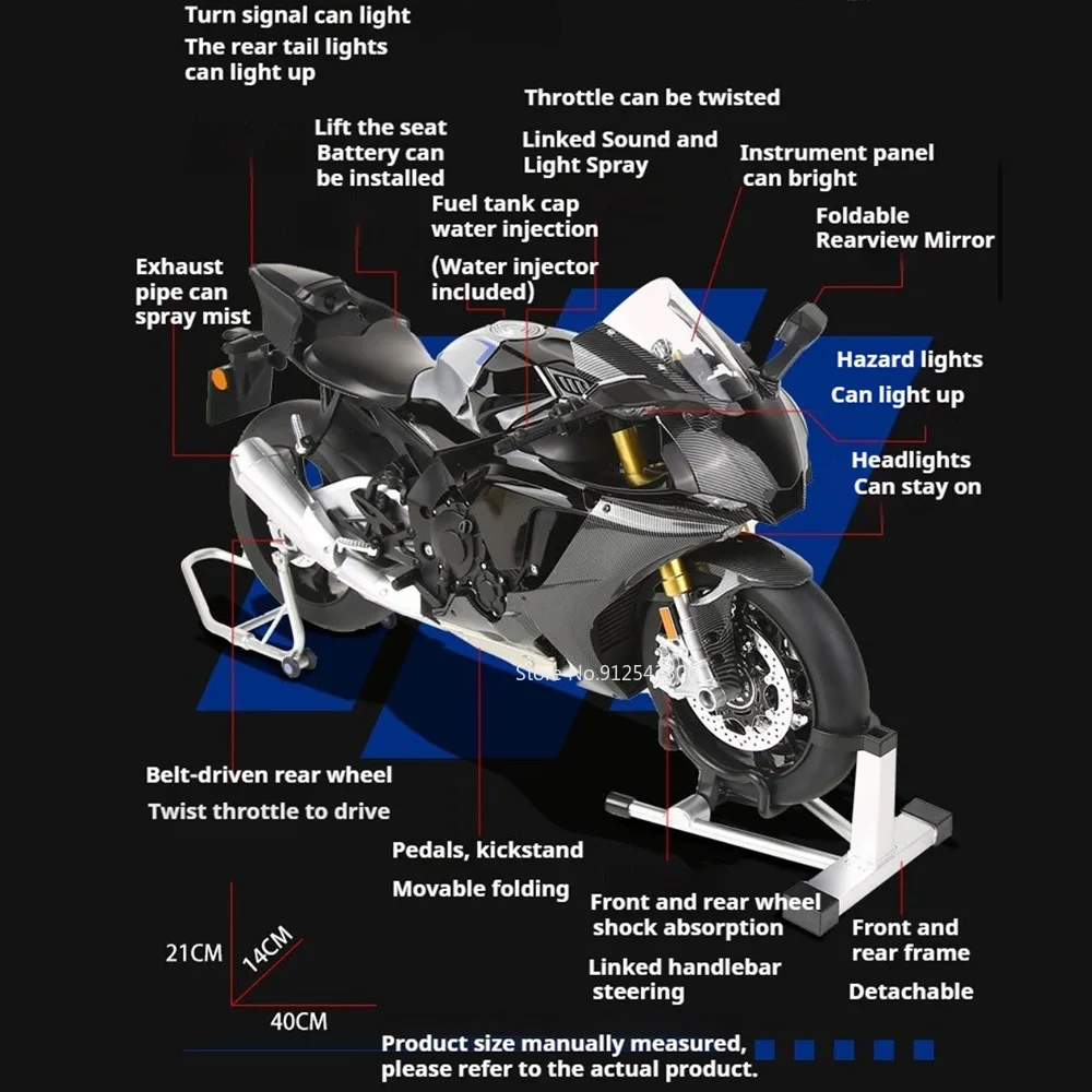 - Designed with a 40 x 14 x 21 cm metal body, mimicking the real high-performance motorcycle with durable construction for long-term display.
