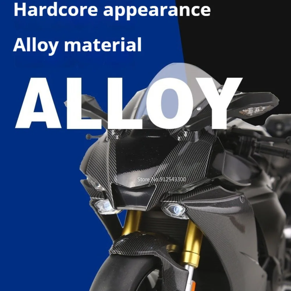 Experience the thrill of high-speed racing with this detailed 1:6 scale motorcycle replica. Crafted with a sleek, aerodynamic design and finished in glossy black, it exudes modern sportiness. Accentuated with carbon fiber-like textures on the front fender and side panels, the model captures every meticulous detail. The bold gold-colored front fork suspension contrasts beautifully against the black body, enhancing its high-performance vibe. Rubber tires mounted on black rims provide a realistic, rugged appearance, complemented by a smooth matte seat and a transparent windscreen. Functional and visually striking, this model is perfect for display or enthusiast collection, immersing you in a world of speed, precision, and style.