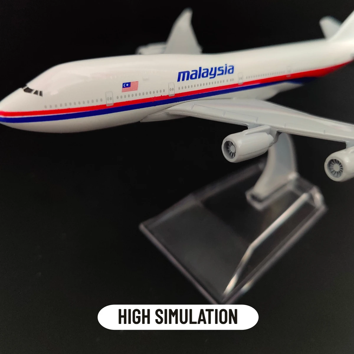 - Constructed from diecast metal, measuring 16 cm, this replica offers durability and realistic weight, ideal for display and collection of Malaysia Airlines' iconic Boeing B747 aircraft.