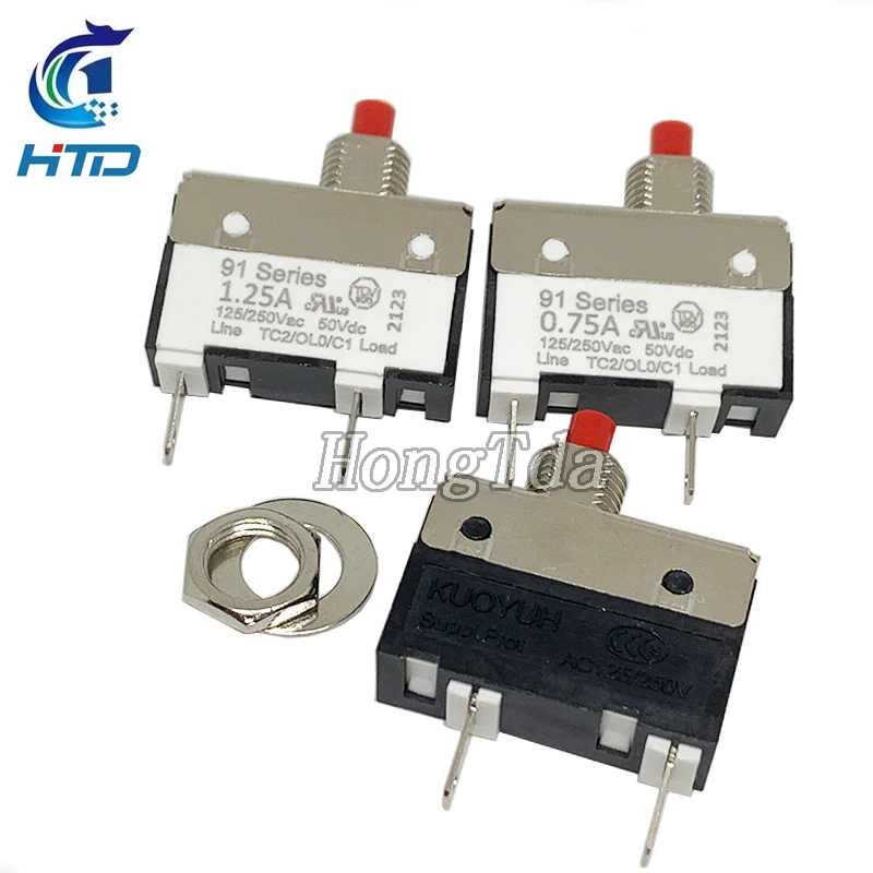 Discover the durability and precision of this this manual reset thermal circuit breaker from the KUOYUH 91 Series. With its robust metal casing and sleek rectangular design, it offers a professional, industrial look suited for various electronic projects. Its smooth surface displays clear technical labels, including current ratings from 0.5A to 3.5A, making selection straightforward. The standout feature is the small, red manual reset button at the top, allowing easy reset after tripping. Equipped with two metal pins for seamless electrical connection and paired with mounting hardware—a hex nut and flat washer—it ensures secure installation. This device is ideal for applications like electric toys, voltage regulation, or overload protection, providing reliable, high-quality overload safeguards. Its minimalist, practical appearance ensures long-term performance, combining function with simple, clean design.