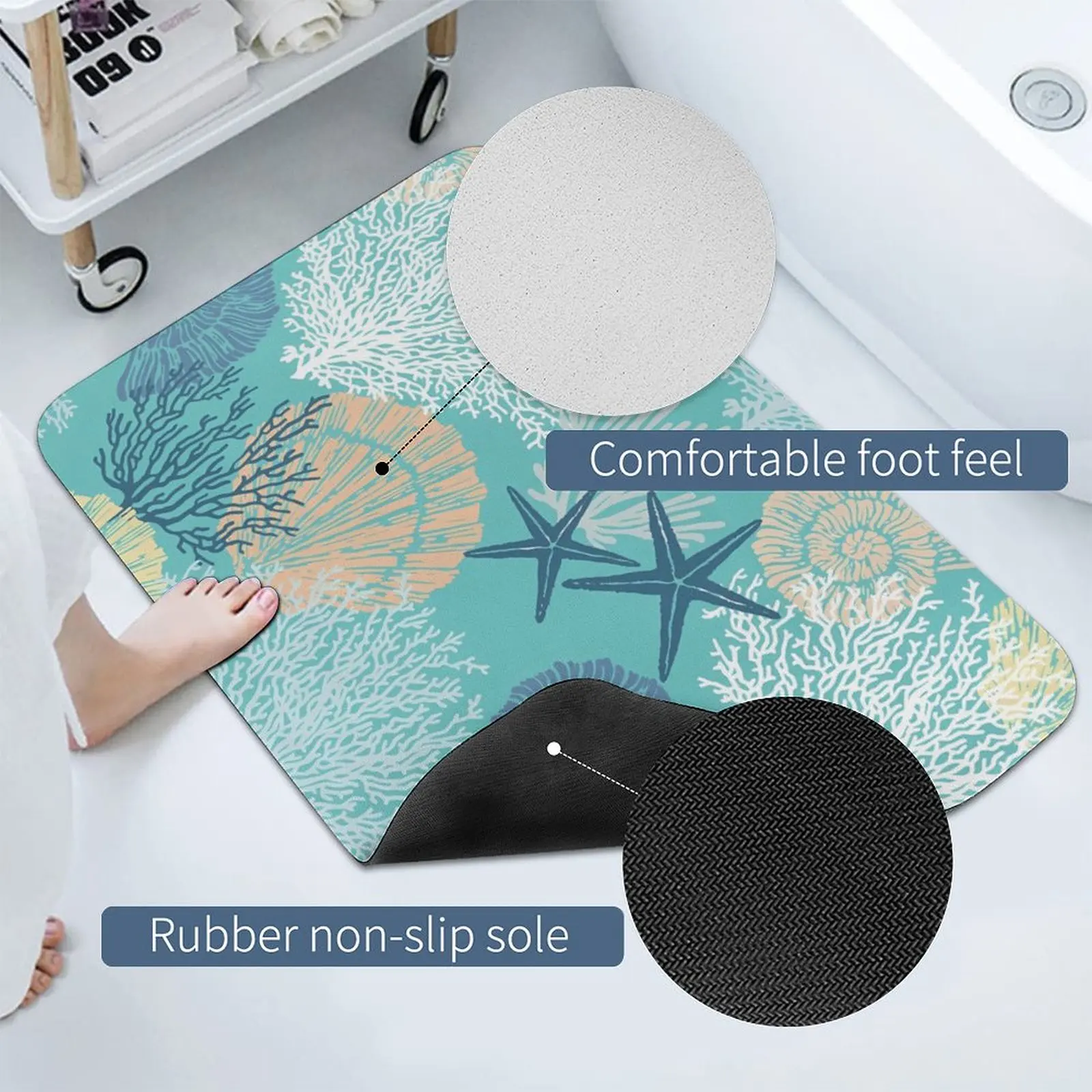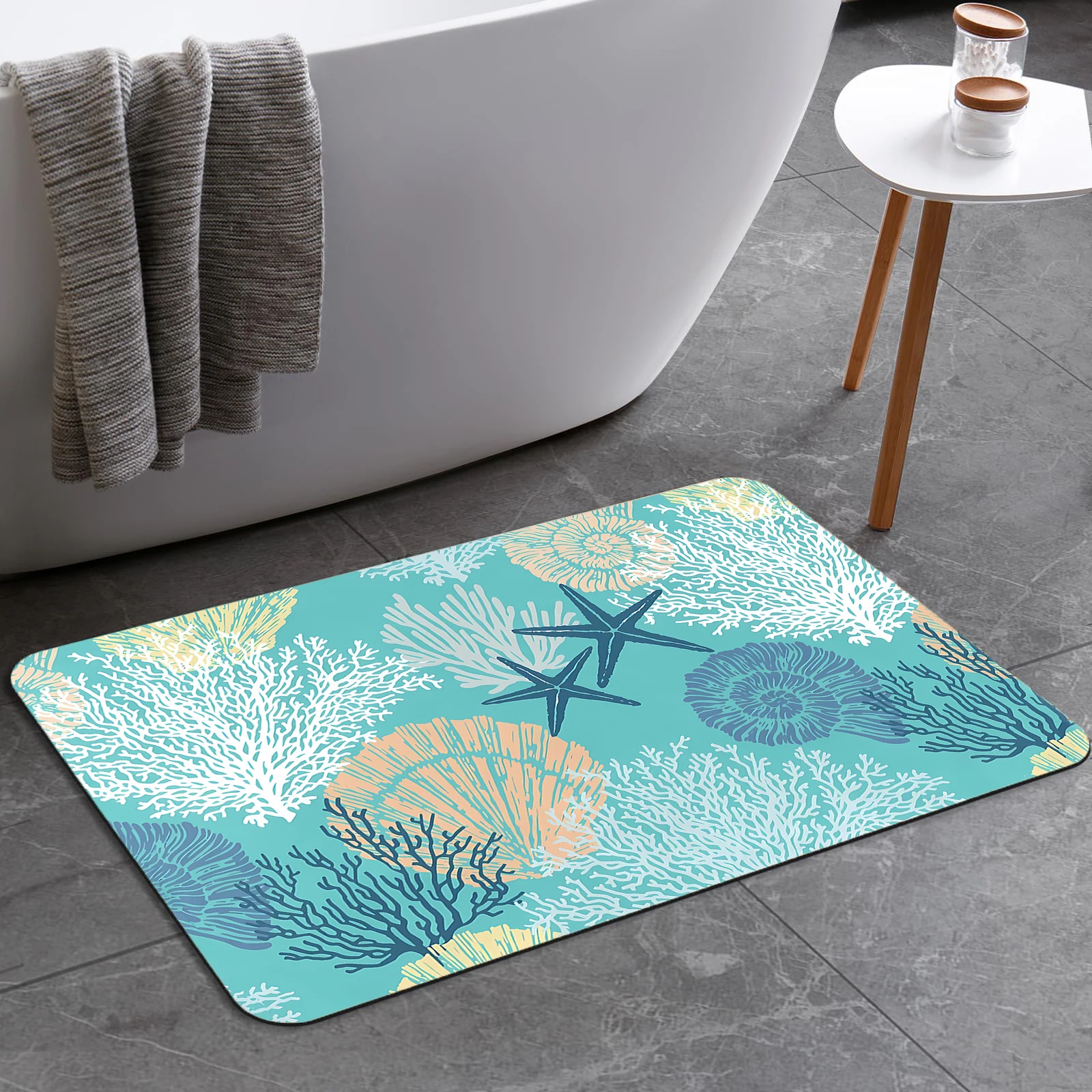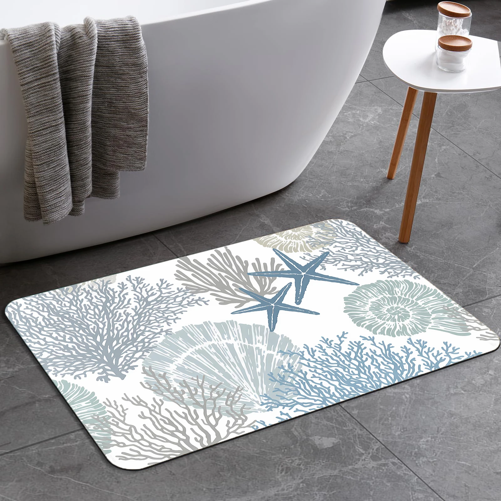 Transform your space with this beautifully crafted, marine-inspired bath mat that brings the calming, lively essence of the ocean into your home. Featuring a detailed pattern of coral, starfish, seashells, and seaweed in shades of blue, beige, and white, this mat adds a decorative touch to any wet or moisture-prone area. Its vibrant design not only enhances your bathroom, kitchen, or laundry room but also provides superior functionality. Made from diatom mud with a rubber non-slip backing, it offers excellent water absorption and quick drying, ensuring safety, cleanliness, and comfort. Lightweight and versatile, it’s perfect for indoor spaces like RV bathrooms, pet areas, or beside sinks, combining practicality with aesthetic appeal.