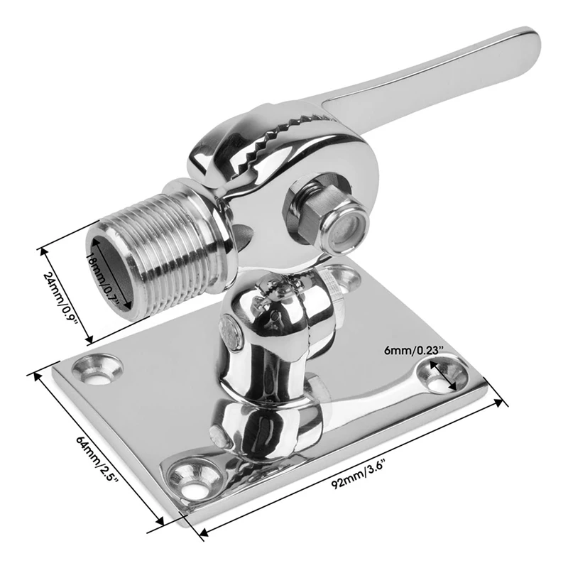 - Technical specifications feature a heavy-duty stainless steel material, a reflective silver finish, dual swivel ratchet design, dimensions of 2 1/2″ x 3 9/16″, compatible with all 1-inch antennas, and designed for adult marine use.