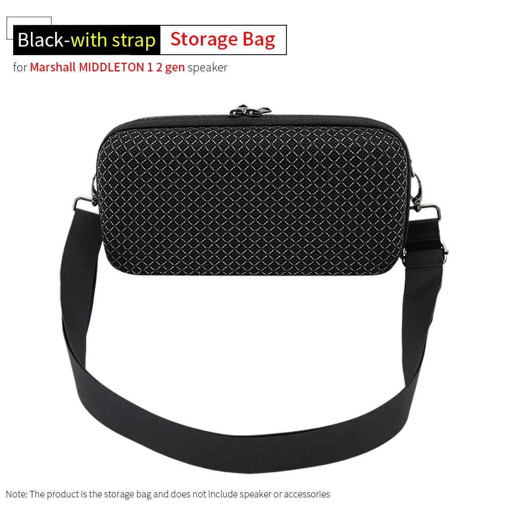 Experience the perfect blend of functionality and modern style with this black shoulder bag designed specifically for Marshall Middleton I/II and 1/2 Gen speakers. Constructed from durable, high-quality transparent fabric, it allows you to enjoy your music without any hindrance, thanks to its sound-permeable material. The sleek rectangular shape with gently rounded edges makes it compact yet spacious for your portable speaker. Choose between the strapless version or one with a wide, adjustable shoulder strap made of smooth, reinforced material for added comfort. Its minimalist yet geometric diamond pattern offers a sophisticated aesthetic, making it an elegant accessory for on-the-go music lovers.