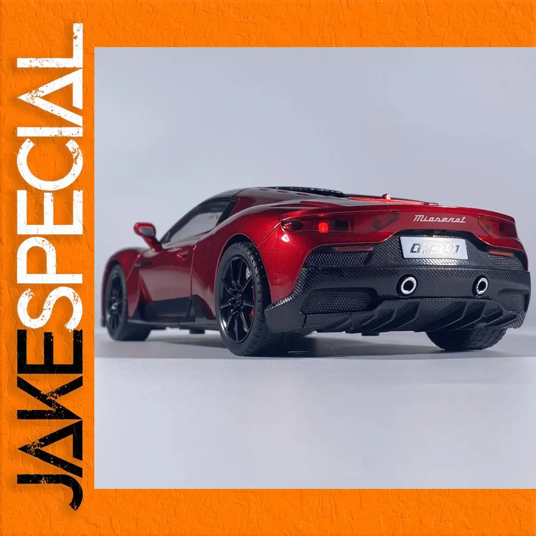 This 1:24 scale diecast model of the Maserati MC20 Convertible Sports Car is a masterpiece for any car enthusiast. Finished in a striking metallic red, this model captures the sleek and aerodynamic design that Maserati is renowned for. It showcases smooth curves, sharp angles, and realistic tail lights with a captivating red illumination effect. The embossed “Maserati” branding above the silver license plate adds an elegant touch. With features like a sporty rear bumper designed with carbon fiber-like texture and dual exhaust outlets, this model is perfect for display. Crafted from durable metal, it also includes a button battery for electric operation, making it a standout piece for any collection or decor.