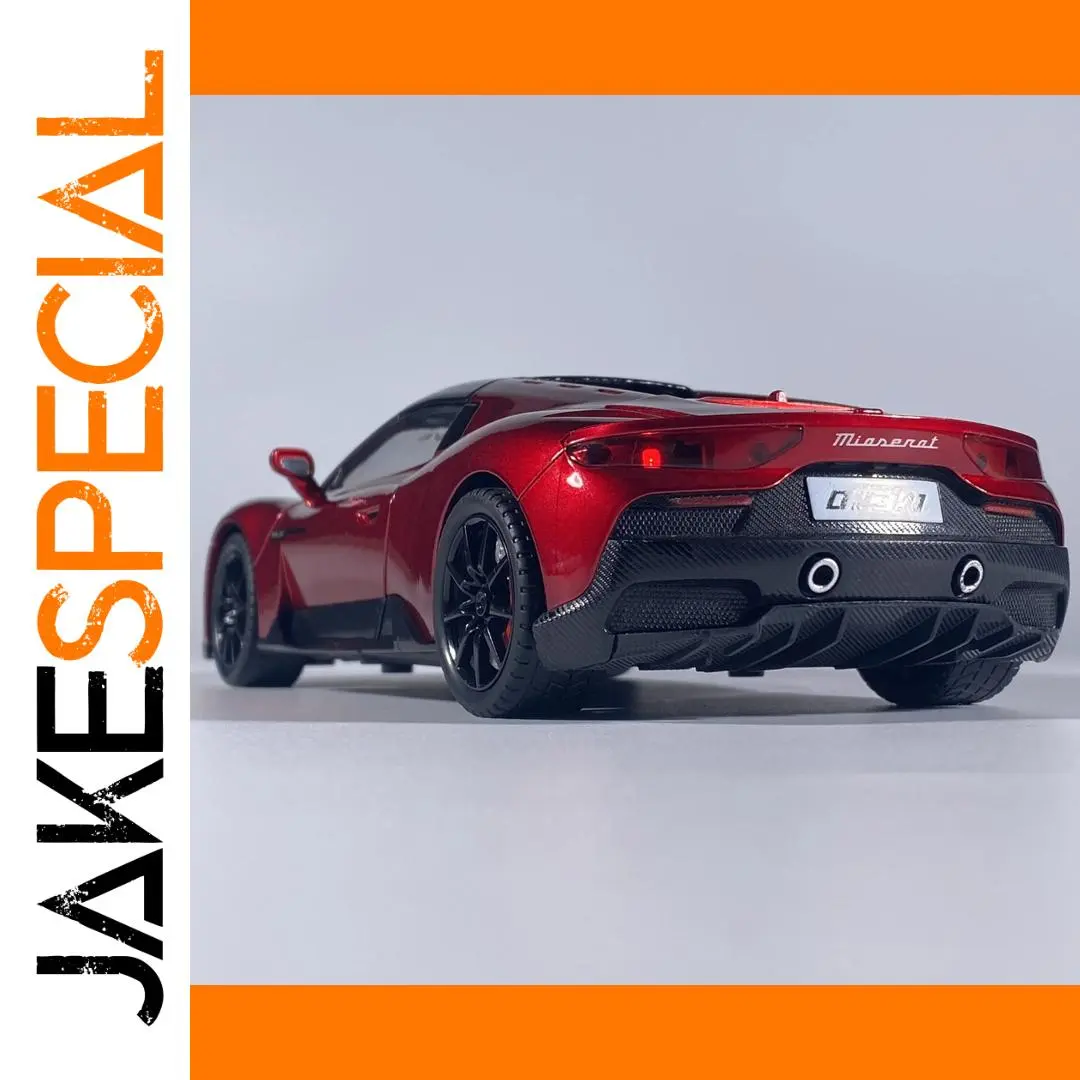- Features include black multi-spoke wheels, textured black rear bumper resembling carbon fiber, with authentic details like taillights, Maserati badge, and license plate design for realism.