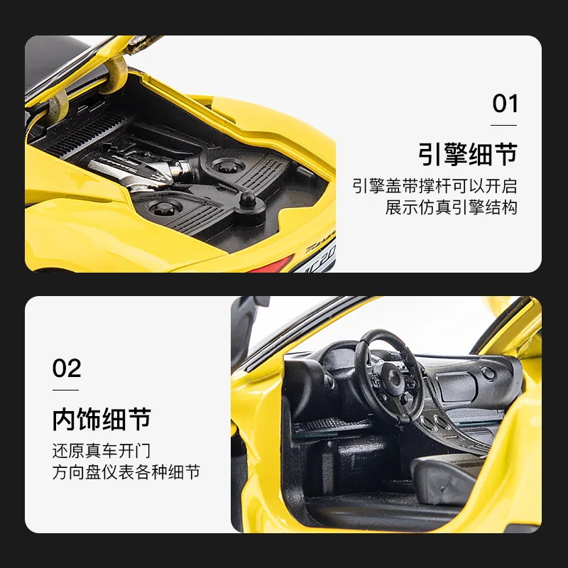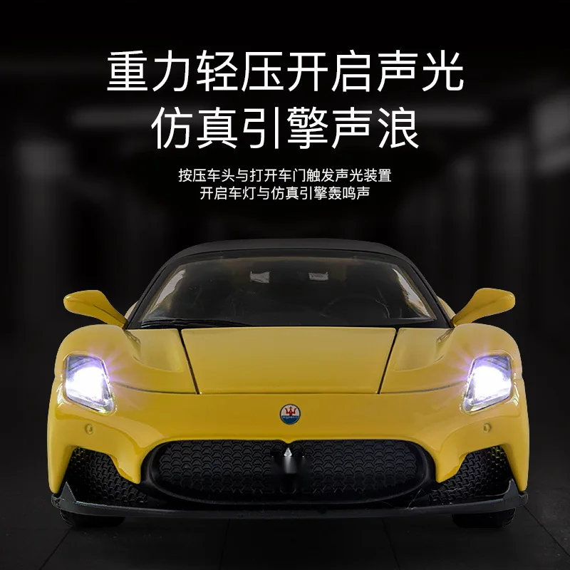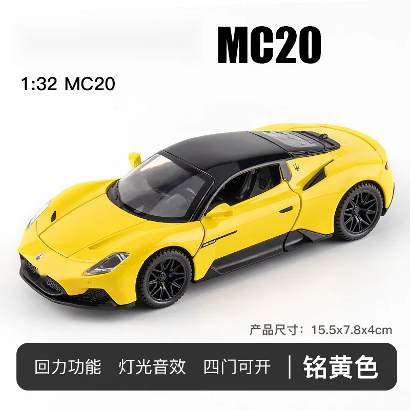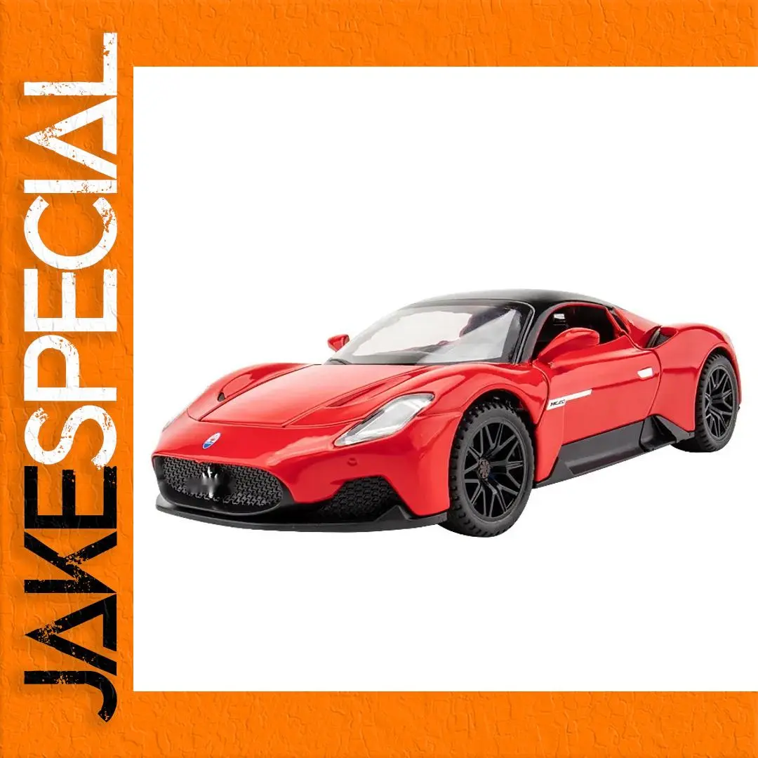 Experience the thrill of the Maserati MC20 Coupe with this highly detailed 1:32 scale diecast metal model, designed for adult collectors and enthusiasts. Featuring a sleek, aerodynamic red body with a contrasting black roof, angular headlights, honeycomb grille, sculpted side lines, black multi-spoke rims, and realistic tire tread, this model captures the sportiness and elegance of the original. Equipped with sound and light functions operated via button batteries and a pull-back mechanism for forward motion, it combines craftsmanship with interactive appeal. Available in various colors with or without a box, this durable, miniature replica is perfect for display or creating your own detailed scene.