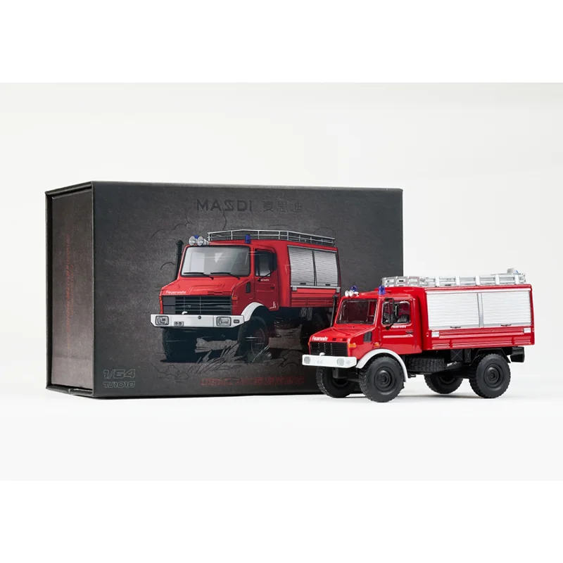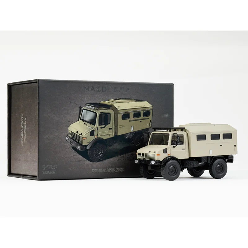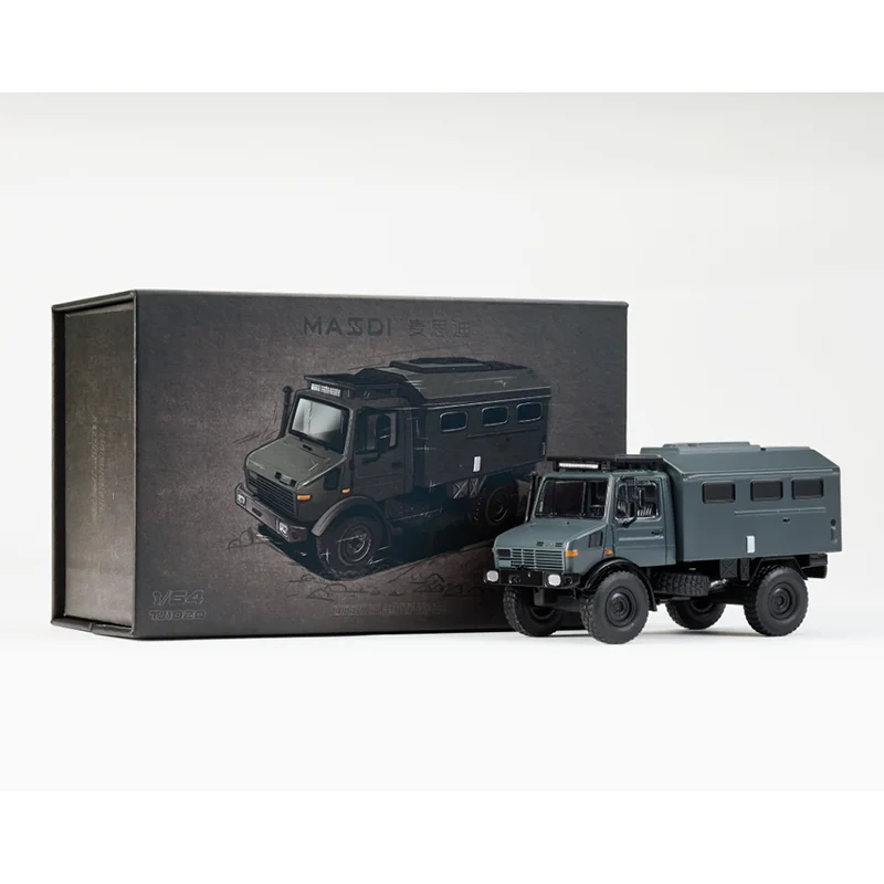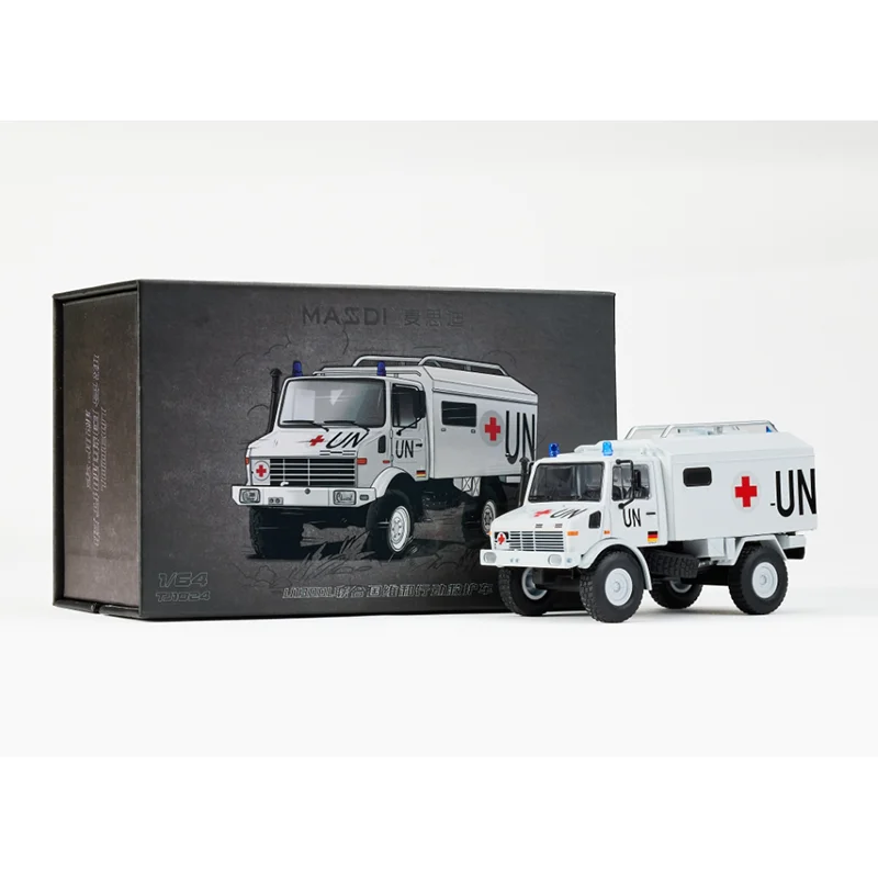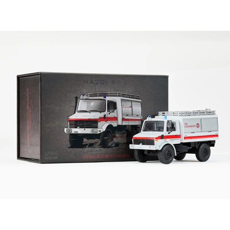 The MASSDI Diecast 1/64 Scale Unimoc U1300L Rescue Off-road RV Truck is a stunning collectible that captures the essence of rugged adventure. Predominantly painted in vibrant blue, this detailed model features accurately designed headlights, grille, and printed side text that marks its identity as a rescue vehicle. Made from durable alloy and plastic materials, it combines aesthetic appeal with longevity. The black textured wheels enhance realism, making it a perfect addition for display or collection. Designed for enthusiasts 14 and up, this model is a true feast for any lover of detailed craftsmanship, designed to reflect charm and utility in perfect harmony.