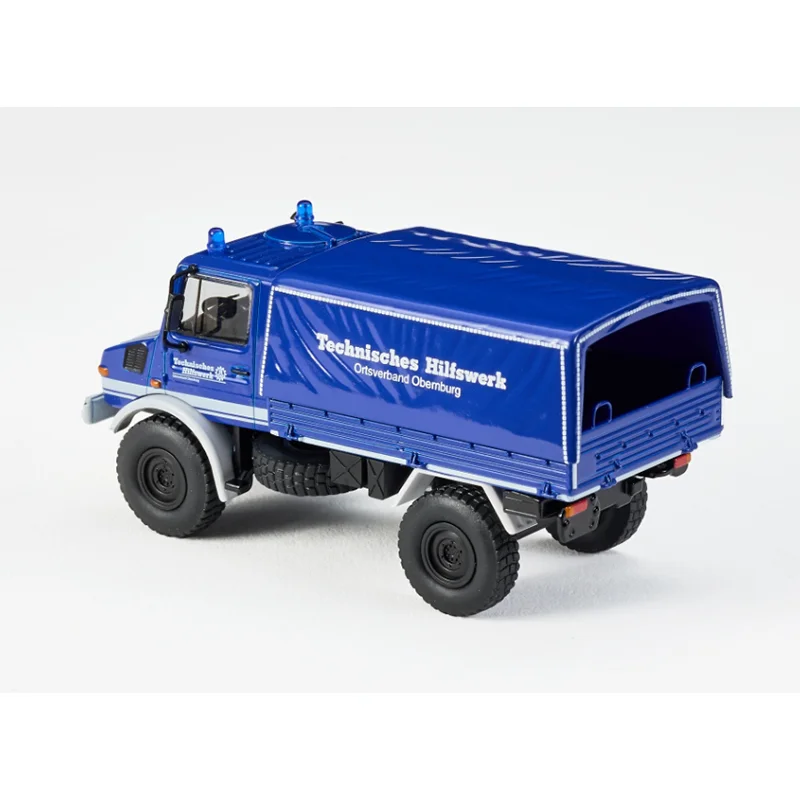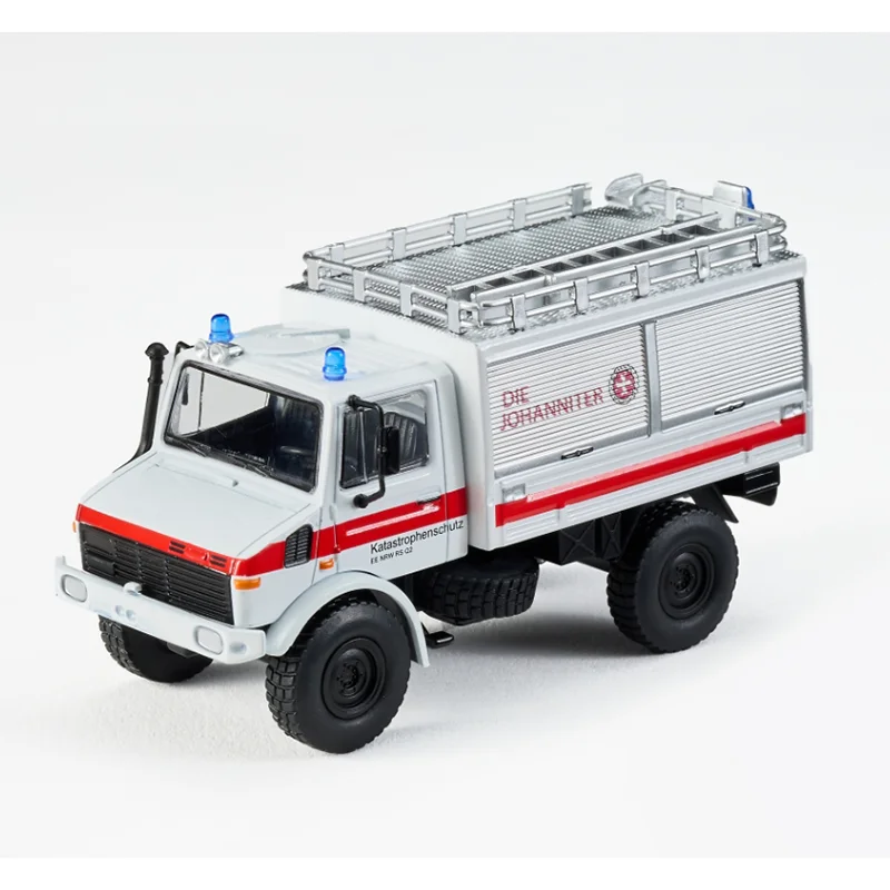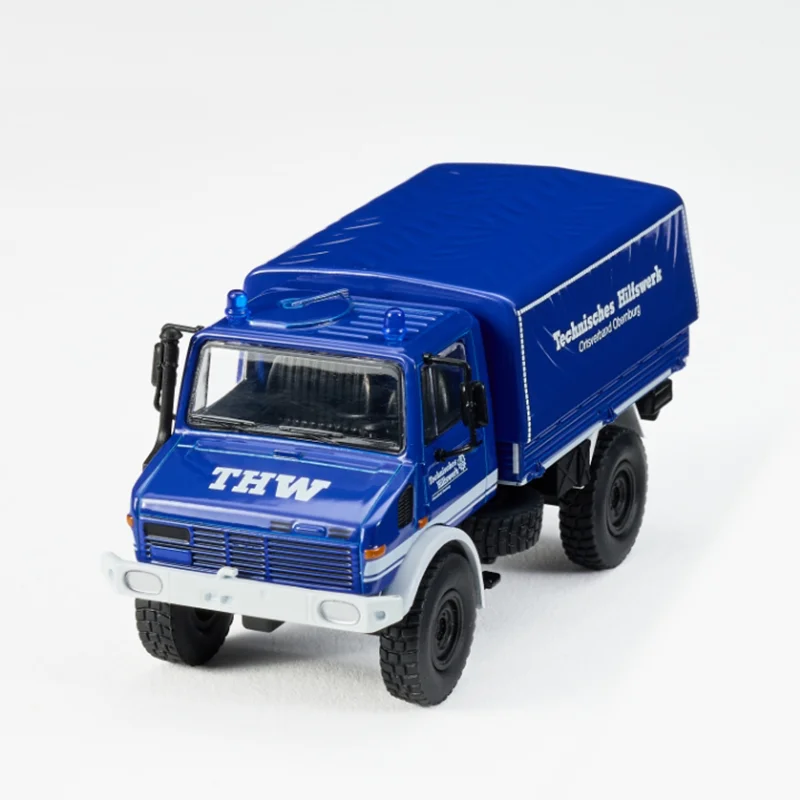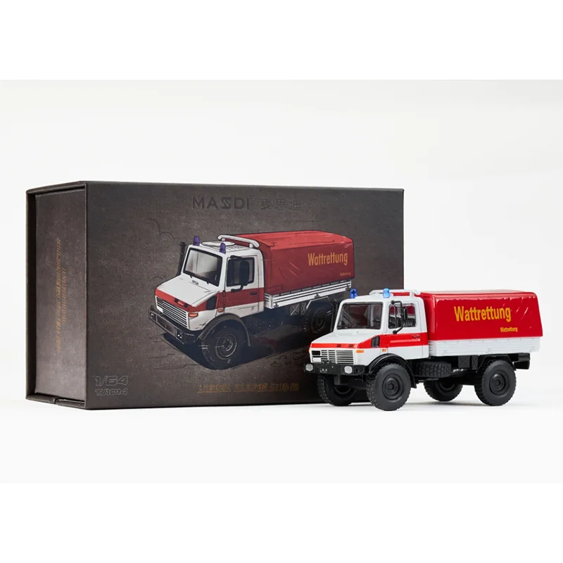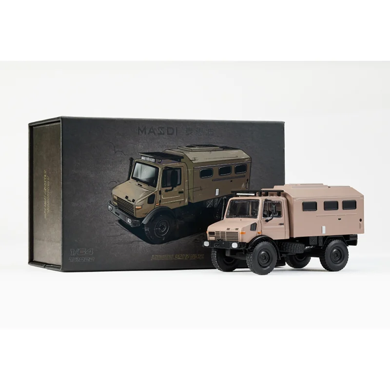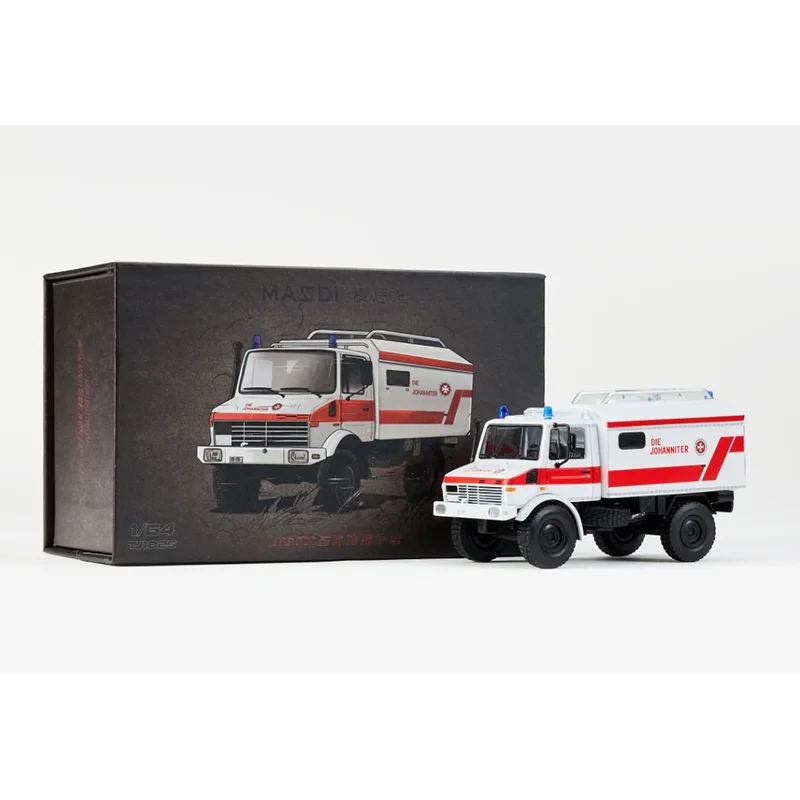 The MASSDI Diecast 1/64 Scale Unimoc U1300L Rescue Off-road RV Truck is a stunning collectible that captures the essence of rugged adventure. Predominantly painted in vibrant blue, this detailed model features accurately designed headlights, grille, and printed side text that marks its identity as a rescue vehicle. Made from durable alloy and plastic materials, it combines aesthetic appeal with longevity. The black textured wheels enhance realism, making it a perfect addition for display or collection. Designed for enthusiasts 14 and up, this model is a true feast for any lover of detailed craftsmanship, designed to reflect charm and utility in perfect harmony.