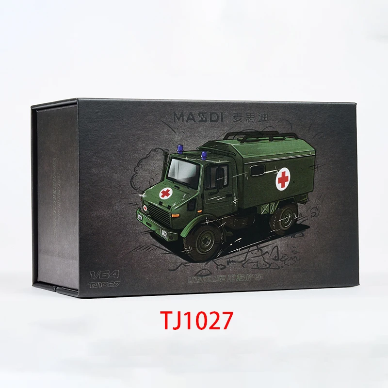This stunning diecast model of the U1300L U300L DLRG Ambulance Truck is crafted to impress military enthusiasts and collectors alike. At a precise 1:64 scale, this model showcases a rugged design in an eye-catching camouflage pattern, featuring various shades of green and brown. Made primarily from durable metal and alloy materials, with plastic components, it highlights exceptional craftsmanship with smooth surfaces, visible seams, and panel lines. The truck's authentic details, such as the tinted windshield, rectangular grille, round headlights, and textured tarp over the cargo area, make it an impressive centerpiece for any collection. This model is a static display piece, emphasizing its intricate design without requiring any batteries.
