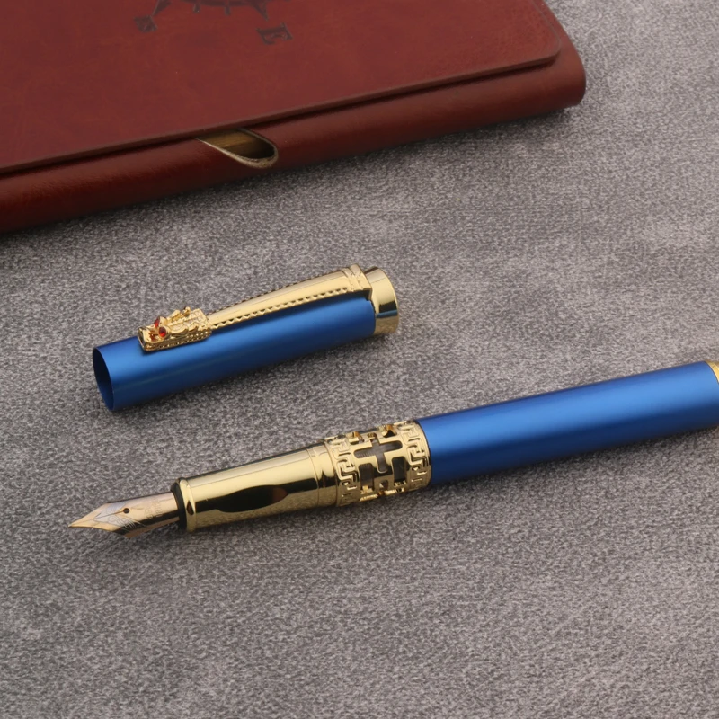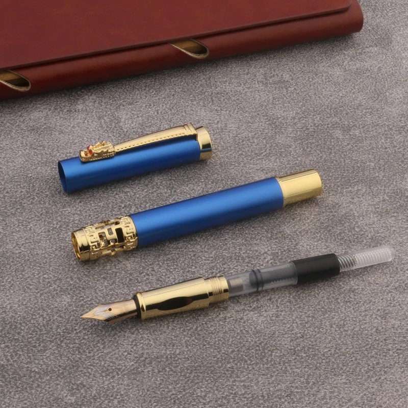 Experience the perfect blend of sophistication and functionality with this this matte blue fountain pen. Crafted with a sleek, cylindrical design, it boasts a smooth matte blue finish that exudes modern elegance. The gold-colored clip with intricate engravings adds a touch of luxury, while the exposed fine tip nib, measuring 0.7mm, ensures precise writing. Made of durable metal with a ceramic nib material, this pen offers both durability and smooth ink flow. Ideal for office, students, or artistic calligraphy, this customized, manual writing instrument elevates your writing experience. Its minimalist style encourages confidence in every stroke, and the unbranded design allows effortless integration into your personal collection or workspace.