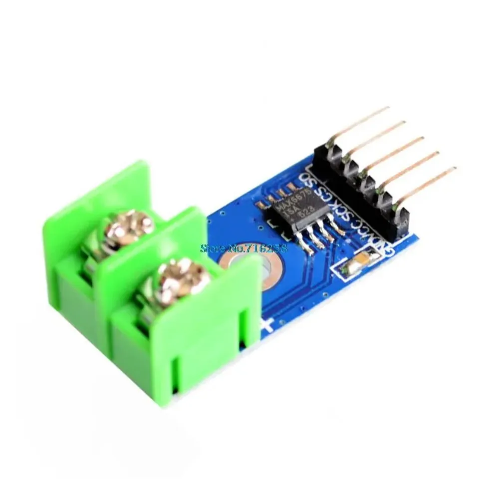 Experience precise temperature measurement with this MAX6675 thermocouple module, featuring a wide operating range of 0 to 800°C and a resolution of 0.25°C. Its compact, blue rectangular circuit board includes integrated cold junction compensation from -20°C to +80°C, thermocouple break detection circuitry, and operates on 3.0V to 5.5V power supply for versatile use. The module utilizes SPI 3-wire serial communication to deliver 12-bit digital temperature output, paired with a durable stainless steel thermocouple probe with a coiled metallic wire for accurate, real-time temperature readings in demanding industrial and scientific applications.