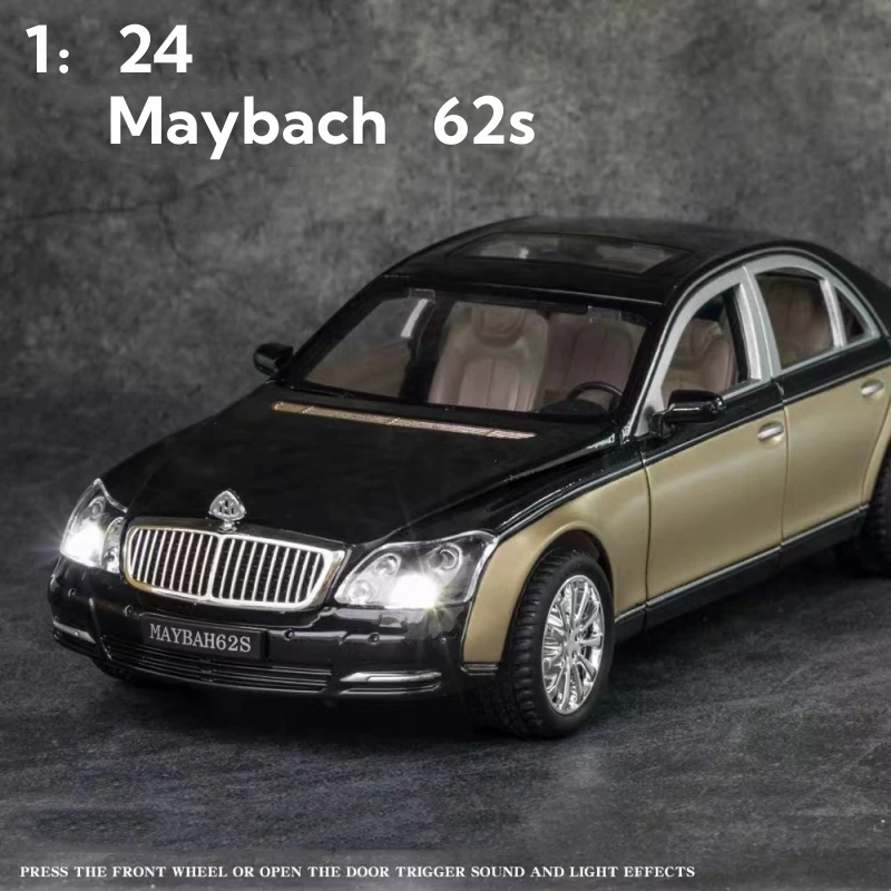 Experience the luxury and elegance of the Maybach S650 62S with this meticulously crafted 1:24 scale diecast alloy model car. Made from high-quality alloy and plastic, the model features a sleek gray or gold finish with a glossy surface that highlights its detailed exterior design, including a distinctive grille with vertical chrome slats and illuminated headlights with a bluish tint. The transparent windows reveal an intricately detailed interior, while the aerodynamic contours and refined features reflect the sophistication of the real vehicle. Perfect for collectors or display enthusiasts, this sturdy, sound and light-equipped miniature is a striking addition to any collection or gift.
