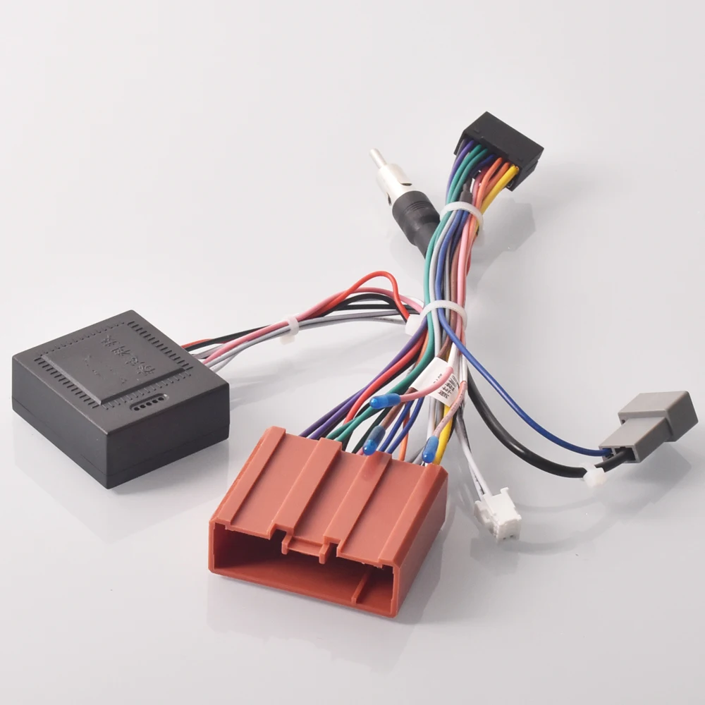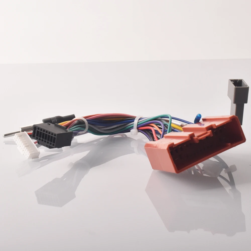 Upgrade your Mazda with this black car stereo wiring harness adapter, approximately 18.5 cm (7.28″) long, featuring a 16-pin Android-style connector compatible with Mazda 3 (2006-2015), Mazda 5 (2008-2015), Mazda 6 (2004-2015), Mazda 8 (2011-2015), and Mazda CX-7 (2014). Designed with Canbus support, it ensures seamless integration between aftermarket head units and factory wiring. Made from durable plastic, the cable includes a pinkish-red connection port, a cylindrical noise-filter component, and securely organized multicolored wires (red, white, black, purple, gray, green, blue). With a 5V power supply and 1W output, this adapter guarantees reliable, tidy installation for an enhanced audio experience.