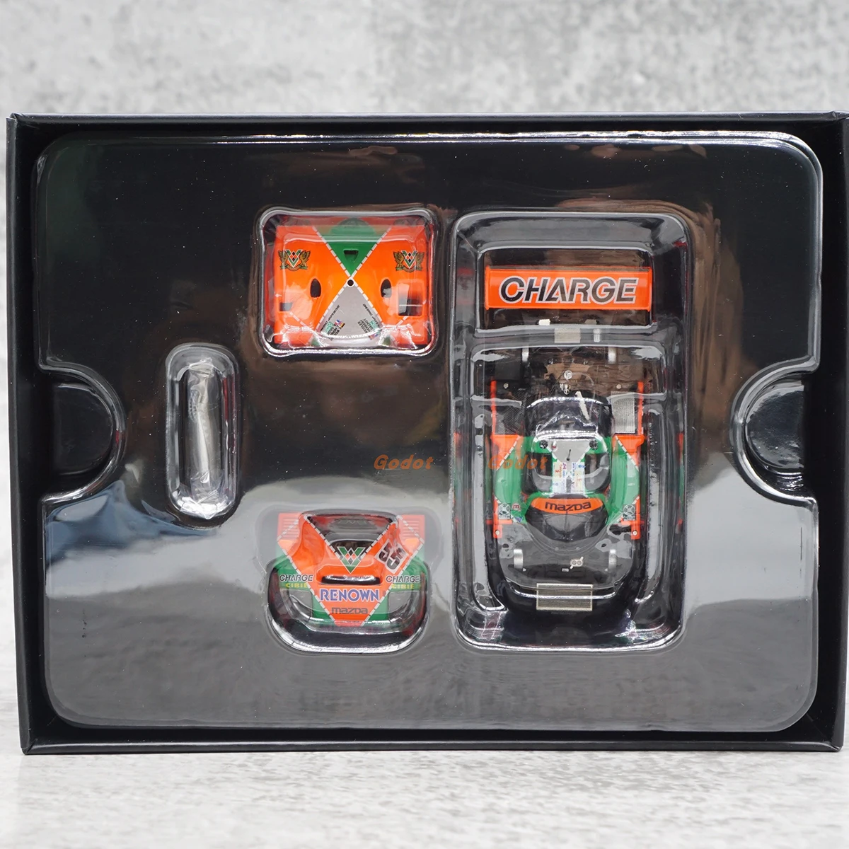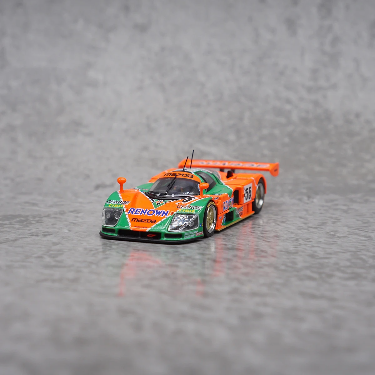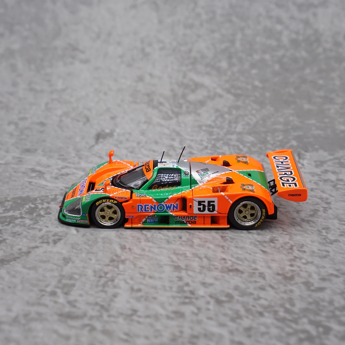 Experience the thrill of racing history with this meticulously crafted 1:64 scale diecast alloy Mazda 787B model. Its vibrant orange and green colors vividly capture the spirit of the legendary vehicle, making it a striking display piece. The aerodynamic design features a pointed nose, sleek curves around the wheel arches, and a prominent rear wing emblazoned with “CHARGE,” replicating the real race car. Built with alloy and ABS plastic components, this model boasts precise decals, sponsor logos, and detailed elements like tiny air vents, antenna poles, and side mirrors. Whether displayed on a shelf or admired up close, this model brings authenticity and nostalgia to any racing enthusiast's collection.
