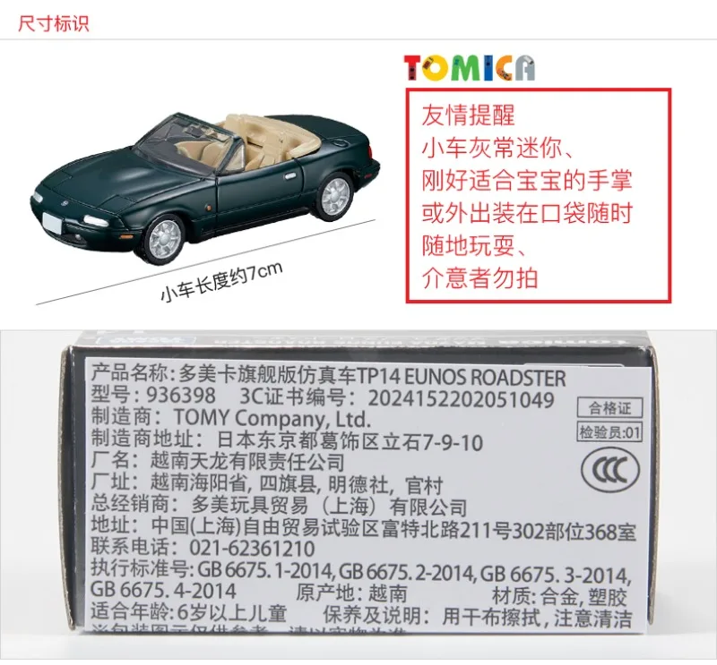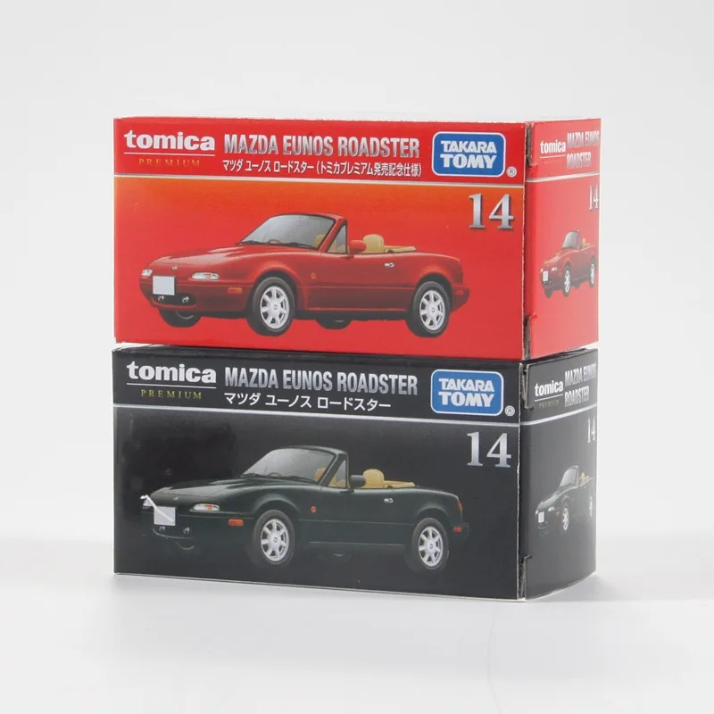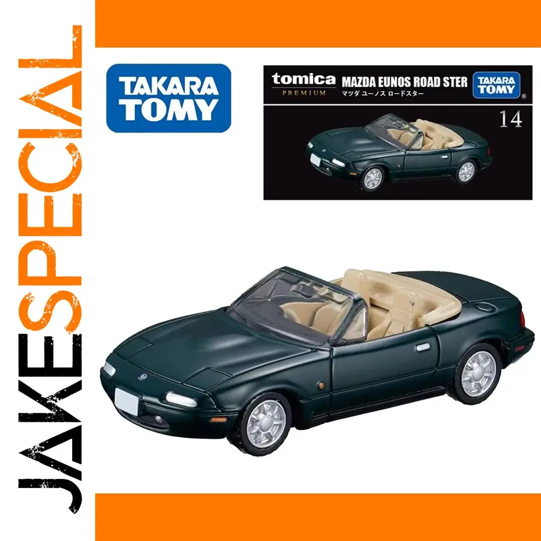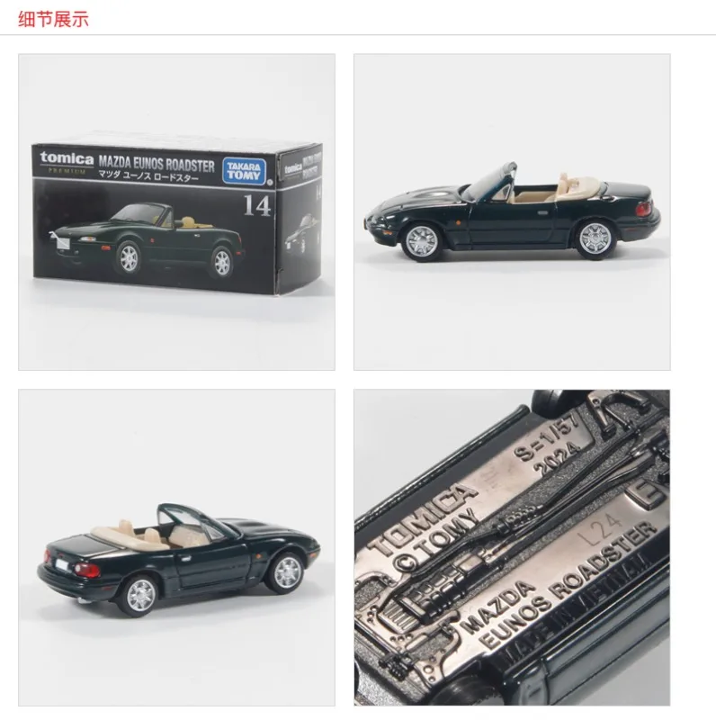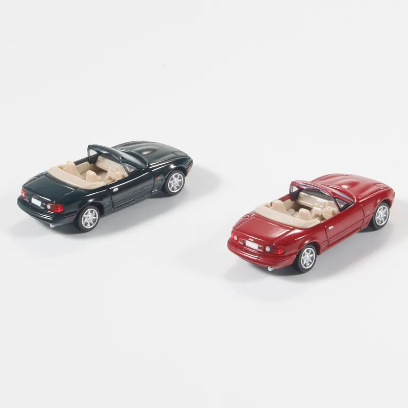 Immerse yourself in the sleek elegance of this Takara Tomy 1:64 scale die-cast model of the Mazda Eunos Roadster, expertly crafted from durable metal for a realistic and premium feel. Showcase the dark green (TP14-green) or vibrant red (TP14-red) exterior with a glossy finish that highlights its aerodynamic lines and intricate details. The convertible roof is retracted, revealing a finely detailed beige interior — including seats, dashboard, and steering wheel — while the front features accurately molded headlights, Mazda badge, and grille. The metallic silver wheels with rubber tires and intricate rim designs add authentic touches, making this collectible a true eye-catching piece for enthusiasts aged 18 and above.
