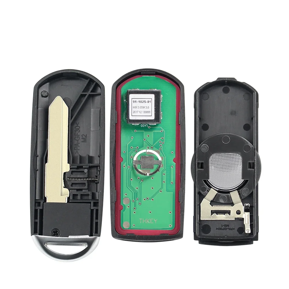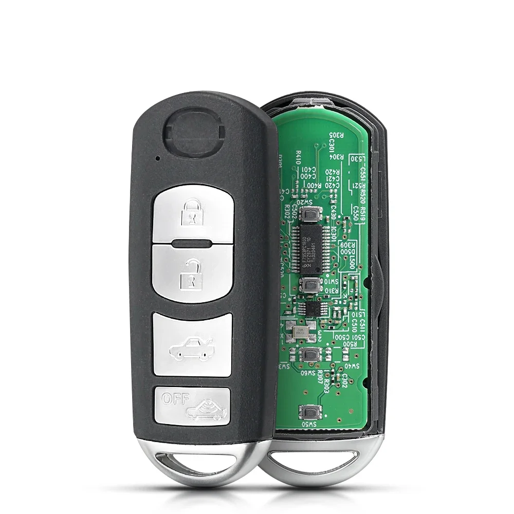 Experience effortless access and a touch of modern sophistication with this this 433MHz smart remote control key designed for Mazda CX-3, CX-5, and Axela models from 2015 to 2018. Crafted with a streamlined, oval-shaped matte black housing for a comfortable grip, it combines minimalist aesthetics with advanced electronic features. The front features white plastic buttons for lock, unlock, trunk, and auxiliary functions, arranged in a clean vertical layout. On the back, a transparent view reveals an intricate green circuit board with chips and electronic components, highlighting precision engineering. Lightweight at 45 grams, it seamlessly integrates into your daily driving routine, offering both style and technology.