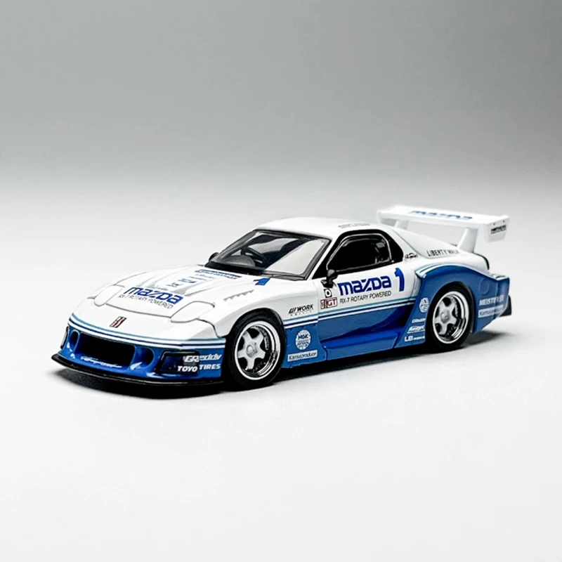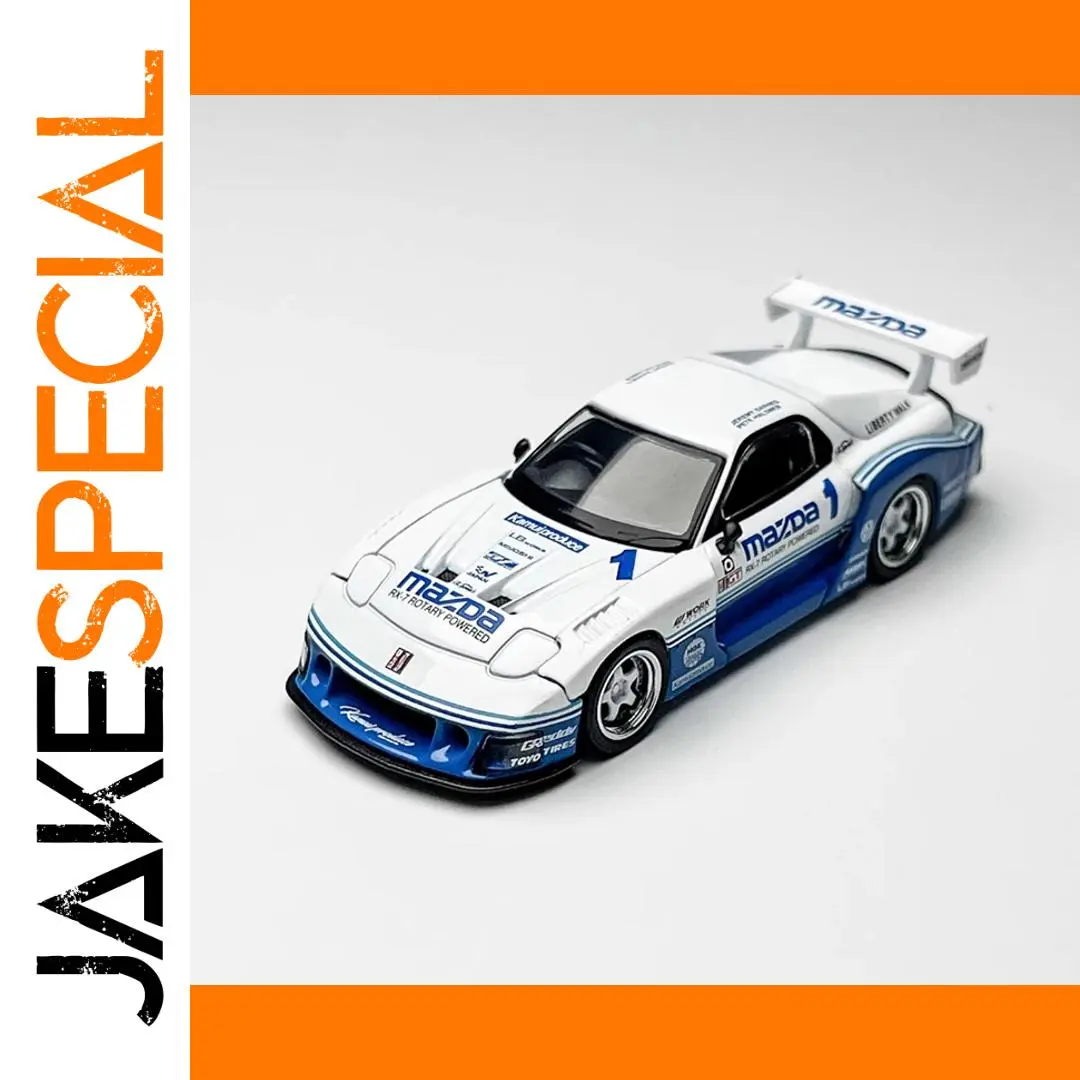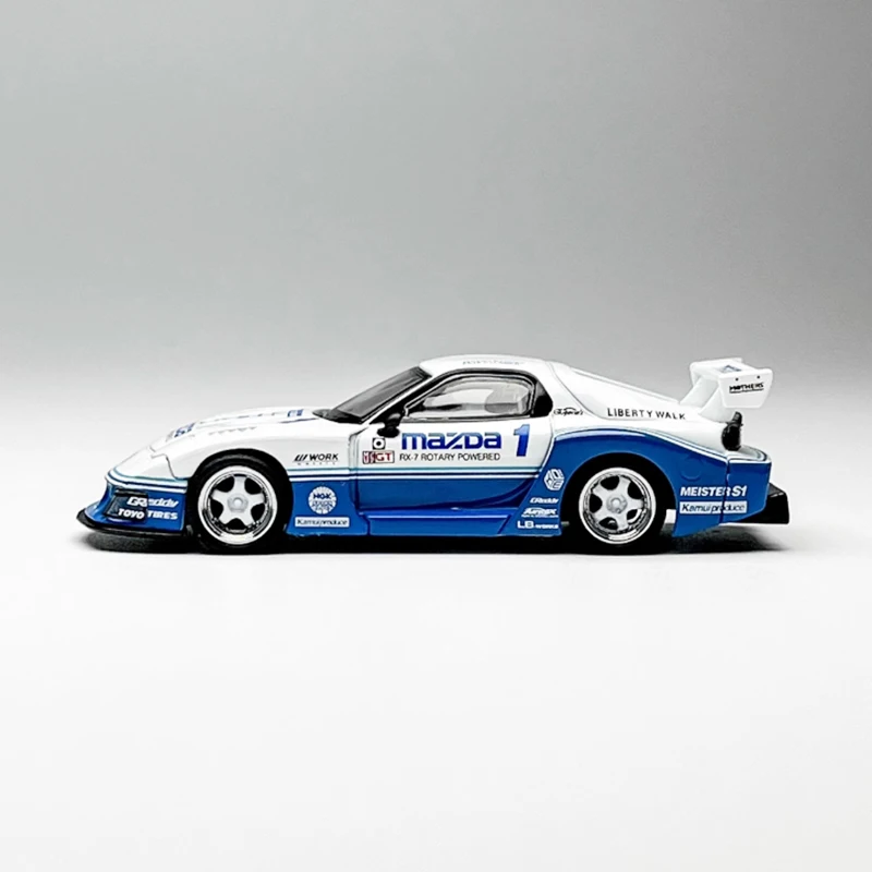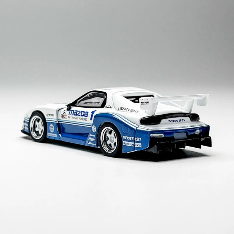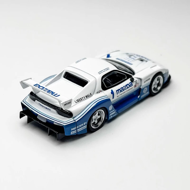 This detailed 1:64 scale diecast replica of the Mazda RX-7 features a sleek white body accented with blue racing decals, alloy and plastic construction, and realistic design elements like flared wheel arches, molded headlights, and a large rear wing spoiler with Mazda branding. Measuring approximately 1/64 of the real car, it’s perfect for adult collectors and display enthusiasts, providing a high-quality, visually striking addition to any collection or décor. Please note, the model may have some manufacturing defects, and measurements are manual with slight deviations. Suitable for ages 14 and above.