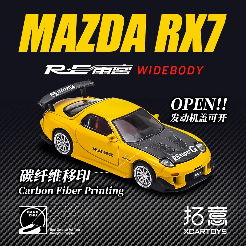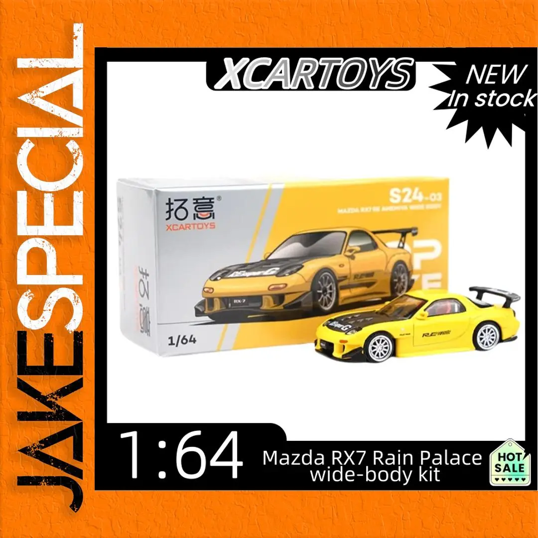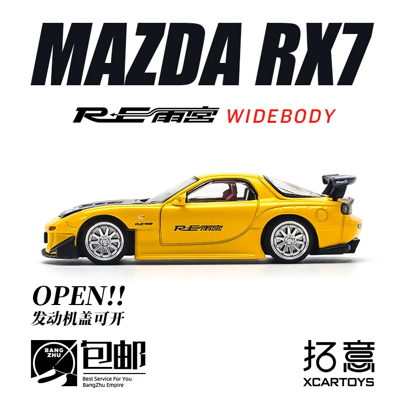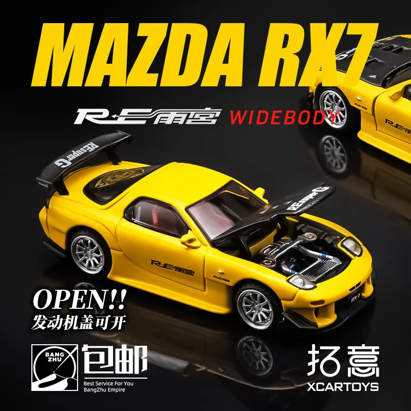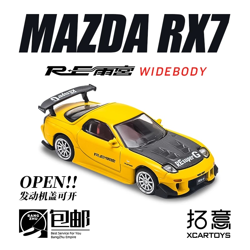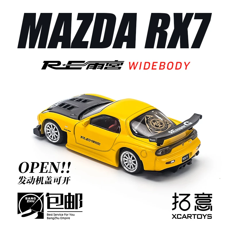 The XCARTOYS 1:64 scale Mazda RX-7 model (S24-03) showcases a stunning wide-body kit design in vibrant yellow with striking black accents. Its sporty and aggressive appearance is enhanced by a large rear wing and sleek body lines, perfect for racing enthusiasts. Crafted from durable diecast metal and alloy, this model measures approximately 7 cm in length, delivering a substantial feel for collectors. With no electronic components, it’s a purely mechanical showcase of automotive artistry. Ideal for enhancing any collection, this model captures the essence of high-performance styling and engineering.