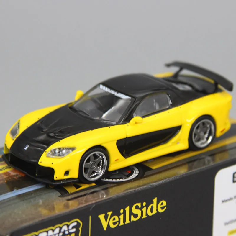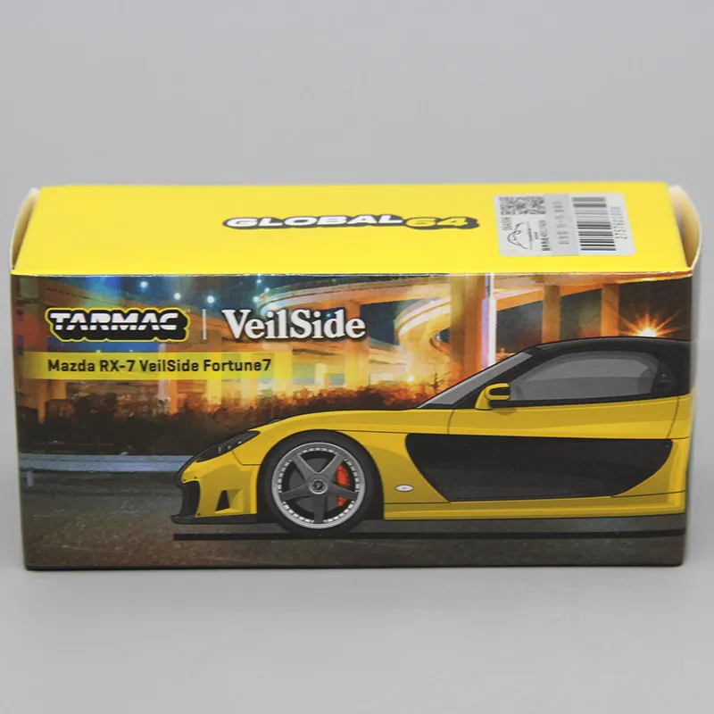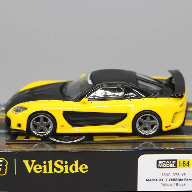 Discover this detailed 1:64 scale diecast model of the Mazda RX-7 VeilSide Fortune7, measuring approximately 7cm in length. Crafted from alloy and plastic, it features a vibrant yellow body accented with black roof, hood, and side extensions, highlighting its sporty, aerodynamic design. The model showcases clear headlights with transparent lenses, realistic multi-spoke rubber-like tires, and matching yellow side mirrors. Its subtle venting details, side skirts, and prominent rear spoiler enhance its dynamic appearance. Perfect for adult collectors and enthusiasts, this unpowered miniature captures the iconic look and precise craftsmanship of the original vehicle, making it an impressive addition to any display.