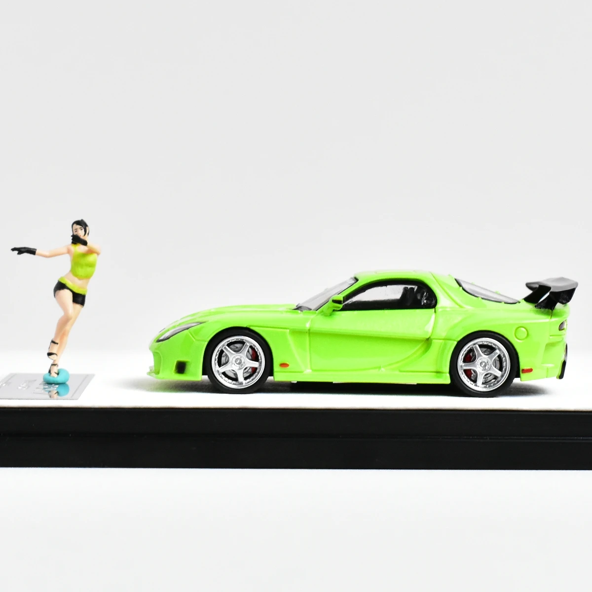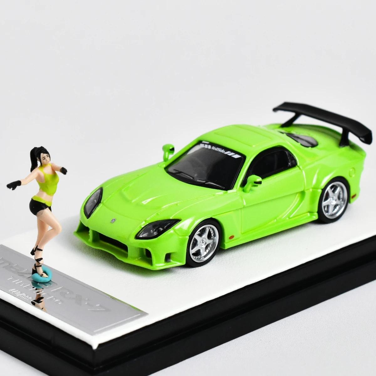 Indulge in the captivating presence of this Mazda RX7 Veilside diecast model car, meticulously crafted for adult collectors. Drenched in a vibrant lime green color, this 1:64 scale model showcases its rich metal construction that conveys both quality and authenticity. With its iconic oversized black spoiler, detailed front headlights, and distinctive grille, this model captures the essence of a race-ready vehicle. The intricately designed wheels feature silver rims and low-profile tires, enhancing the sporty vibe. Imagine proudly displaying this masterpiece, as it draws admirers and complements your collection beautifully.