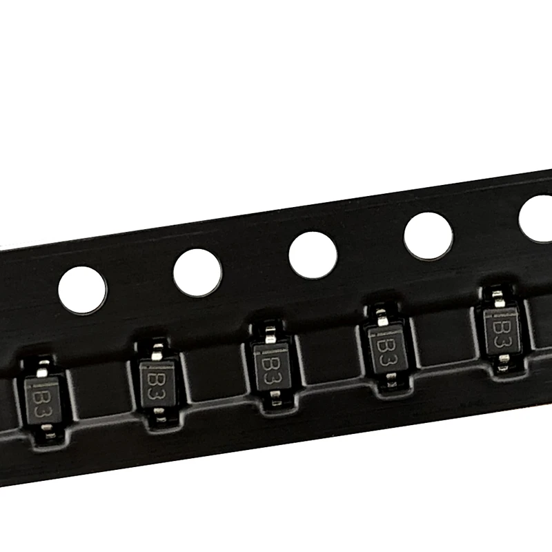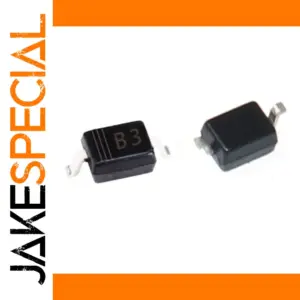 Imagine seamlessly integrating this high-quality Schottky diode into your electronic projects, enhancing performance with reliability and precision. Its black, rectangular shape with a flat top surface and slightly rounded edges offers a modern, minimalist aesthetic that complements any circuit board. The metallic leads, thin and bent outward, ensure easy soldering and secure connections. One diode features clear gold markings reading “B3” alongside three parallel lines, indicating polarity for easy identification. This component’s clean design combined with robust technical specs ensures it functions flawlessly, providing low forward voltage drop and efficient energy conduction. Whether designing new systems or repairing existing ones, this diode guarantees consistent performance and long-term durability in your electronic applications.