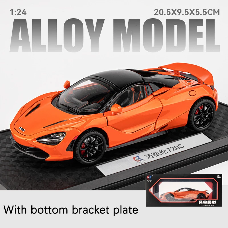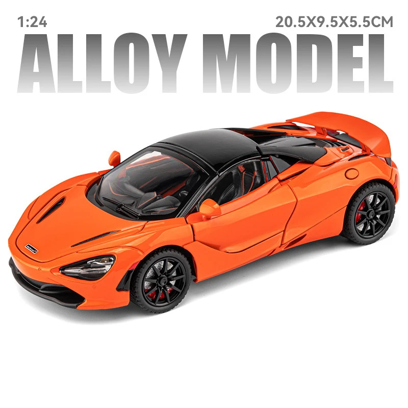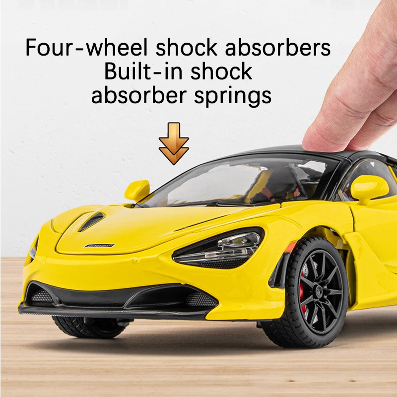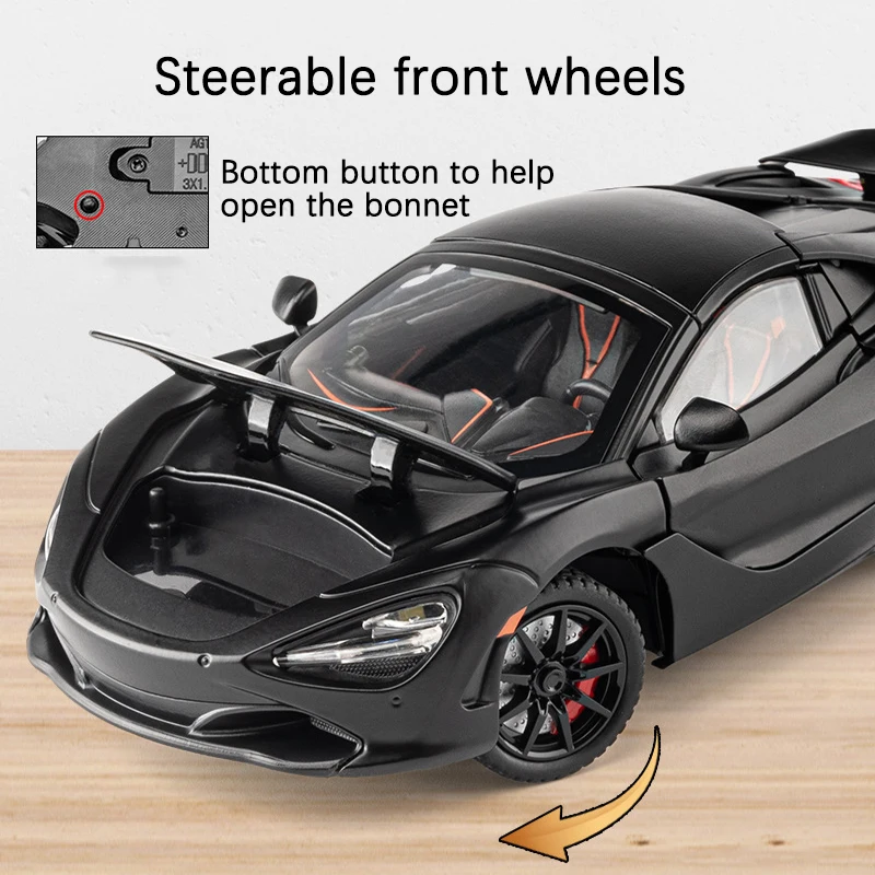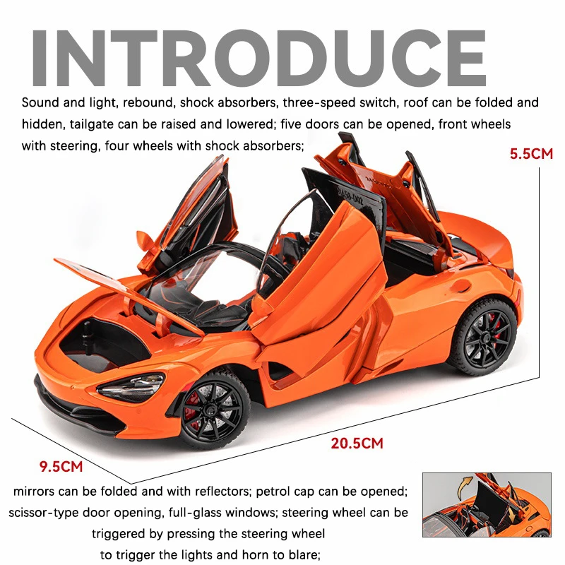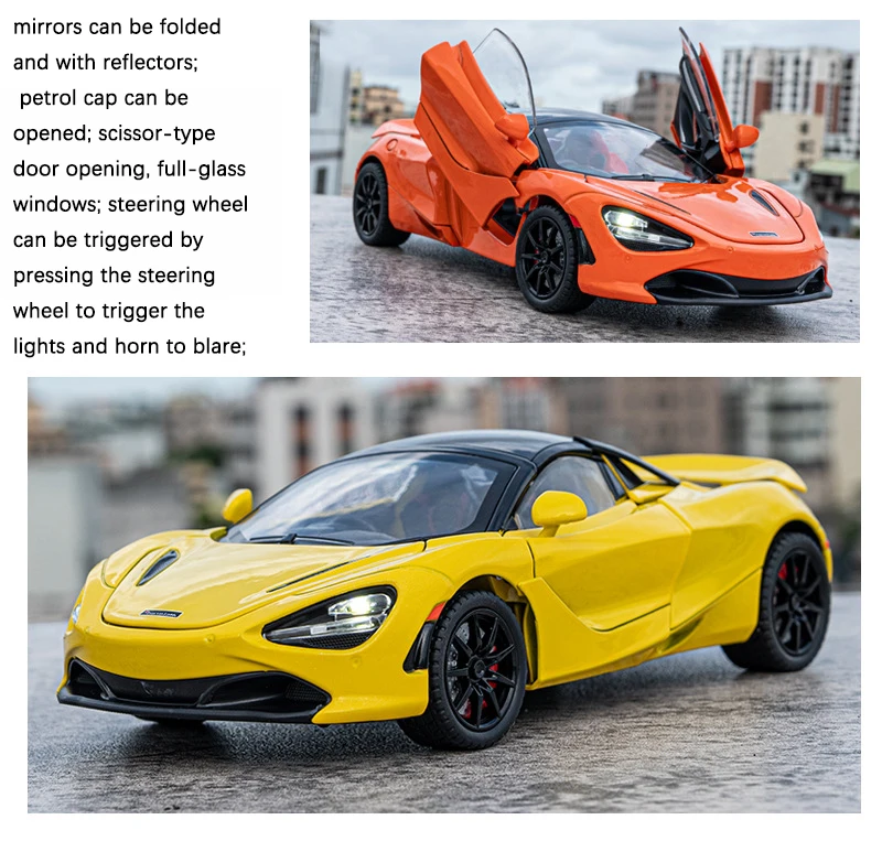 Experience the thrill of owning a stunning 1:24 scale diecast model car of the McLaren 720S. This remarkable collection features four distinct colors – sporty orange with black accents, sleek white with contrasting details, vibrant yellow, and classic black, ensuring there's a piece to match every personality. Crafted from high-quality metal, these models display intricate detailing, including realistic headlights, taillights, and aerodynamic curves that mimic the legendary design of the original vehicle. With built-in sound and light functions, these models provide interactive enjoyment without the need for batteries, making them perfect for both display and play.