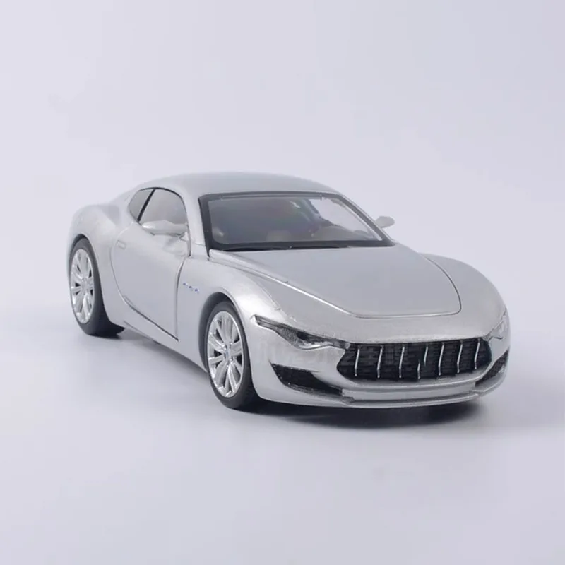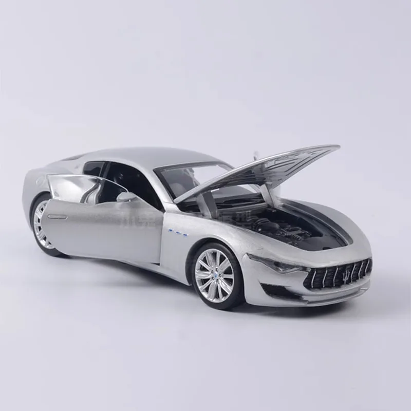 - Features finely detailed parts including black grille, sharply angled headlights, alloy multi-spoked silver wheels, and transparent windows revealing an interior detailed with dashboard and seats.