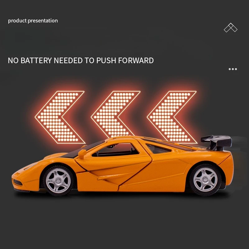 Step into the world of high-performance racing with this stunning 1:36 scale diecast miniature of the iconic McLaren F1 from 1993. Crafted with meticulous attention to detail, this replica showcases the car’s sleek, aerodynamic profile and sporty features. The body is finished in a dazzling metallic silver, highlighting the smooth curves and flowing lines that define its athletic stance. The sharply designed headlights with clear lenses and amber turn signals add realism. Visible through the transparent windshield are meticulously detailed orange seats that mimic the original interior. The prominent rear wing spoiler and aerodynamic side skirts emphasize its race-inspired aesthetic, making it an excellent collector's item or an exciting toy for enthusiasts.