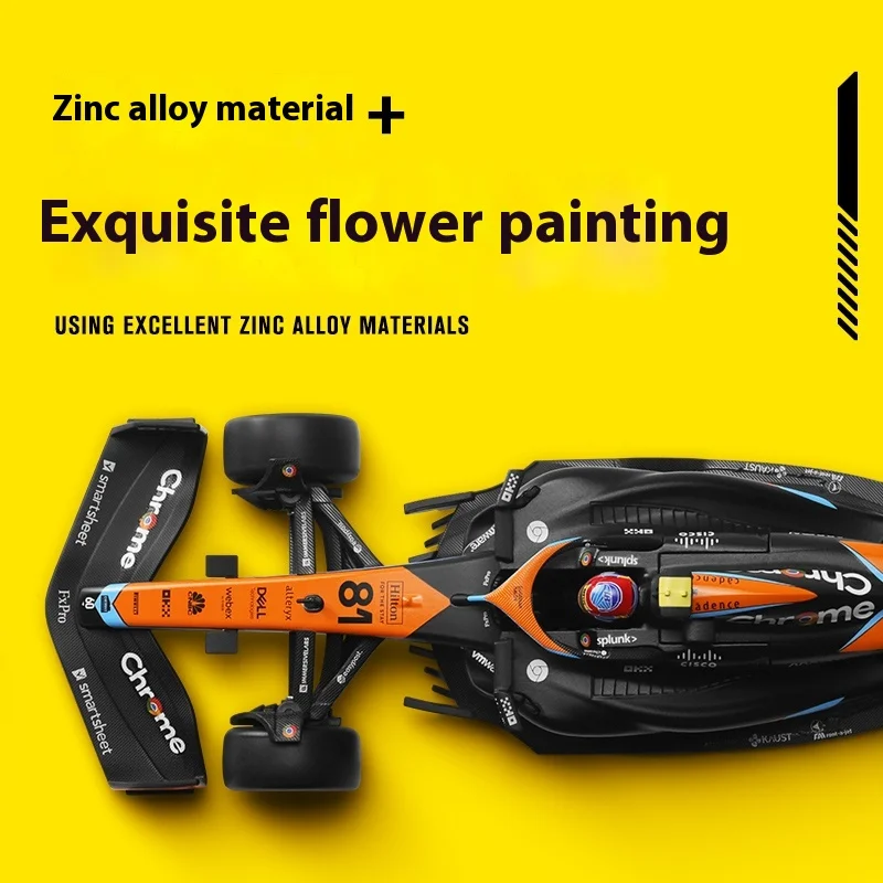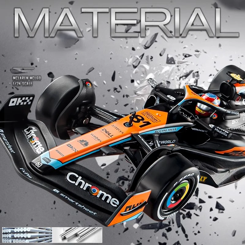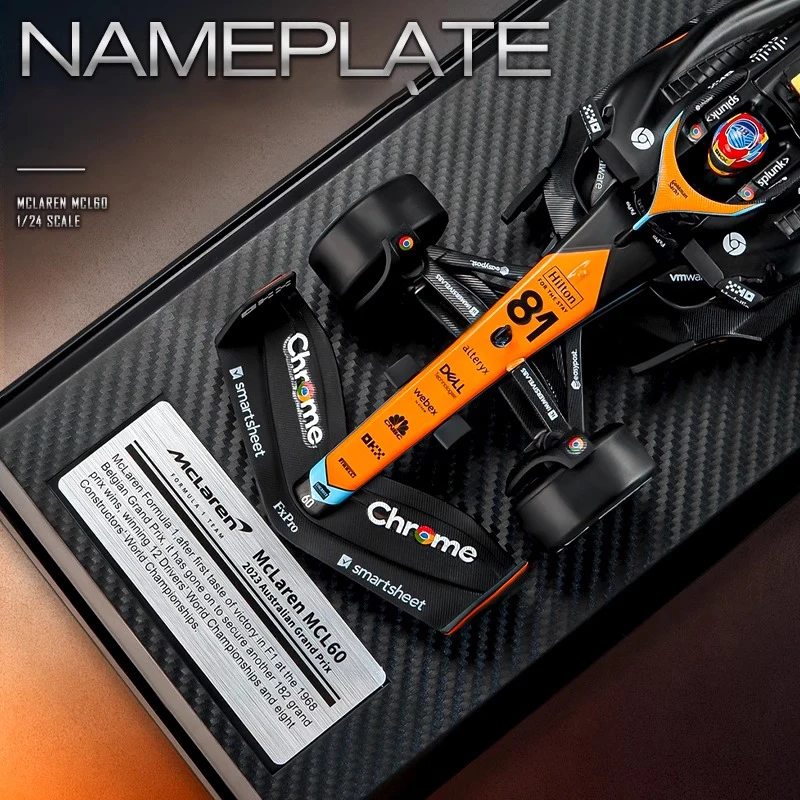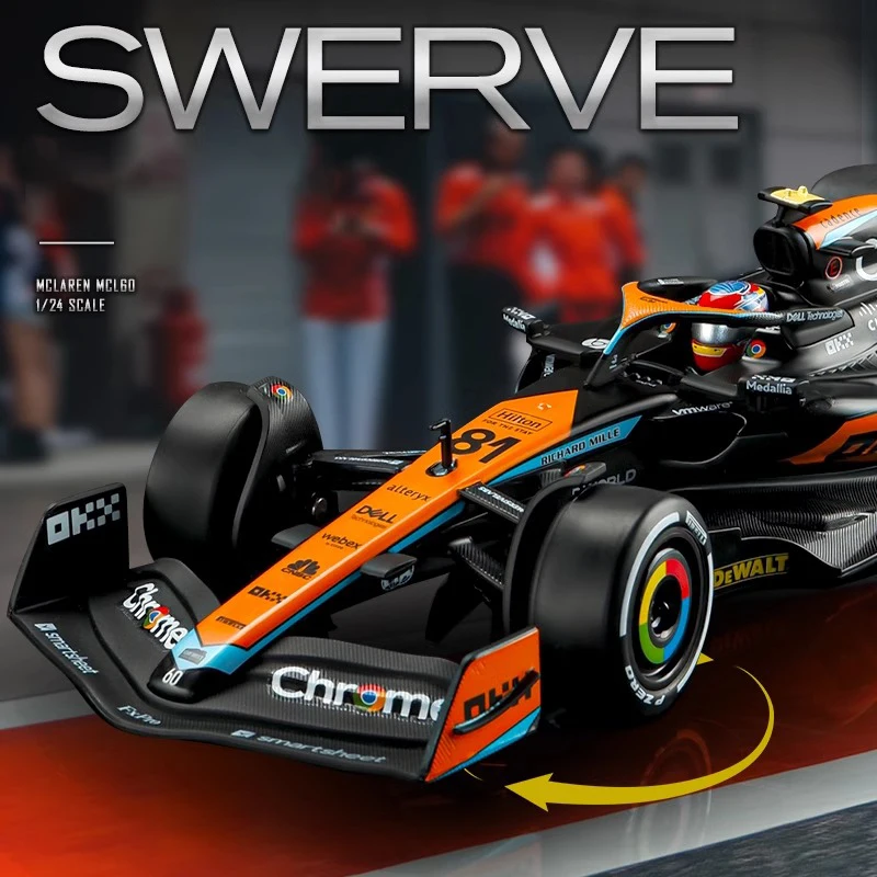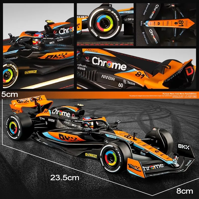 Experience the thrill of Formula 1 with this meticulously crafted 1:24 scale diecast alloy model of the McLaren F1 Team MCL60, driven by Lando Norris (#4) and Oscar Piastri (#81). Featuring a sleek, aerodynamic design, the model showcases a black body accented with vibrant orange and blue highlights, detailed panel lines, vents, and sponsor decals for authenticity. The bright orange rear wing with black logos and multi-colored wheels with yellow and multicolored rings add striking visual appeal. Made from durable metal, this non-electric collectible is perfect for adult enthusiasts, offering a high-quality display piece that captures the high-performance essence of F1 racing.